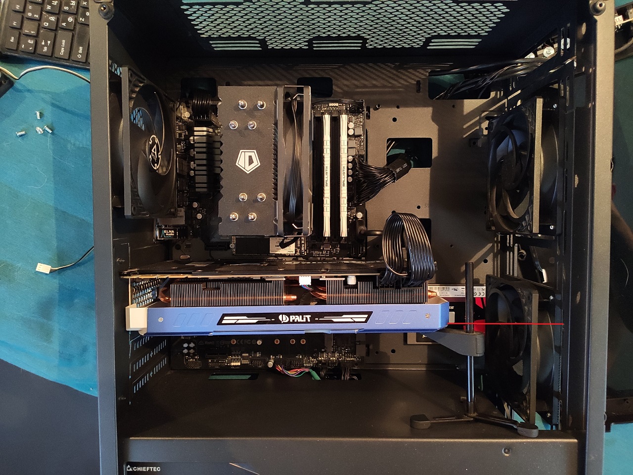 Через заглушки под видеокартой тоже будет воздух тянуться, если их не заклеить или заменить на цельные. Кстати по-моему подпорка слишком выгибает карту вверх.