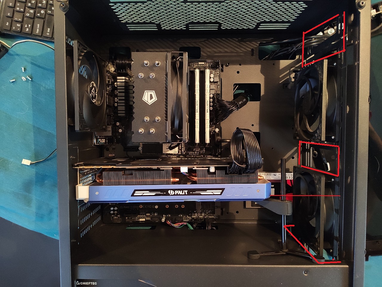 Да, все логично. Пока что я остановился на варианте 2 на 2, посмотрю как с пылью будет (2 на вдув, 1 выдув сзади, 1 выдув сверху сзади, перед сверху заклеил). Наверх я решил поставить из-за того что читал в теме батл про воздушные пузыри, и ради интереса вернул вентилятор, тк у меня между задним и верхним выдувом довольно большой кусок получается (не как на рисунках в статье coolio), они не впритык стоят, мне показалось что не должны мешать друг другу.
