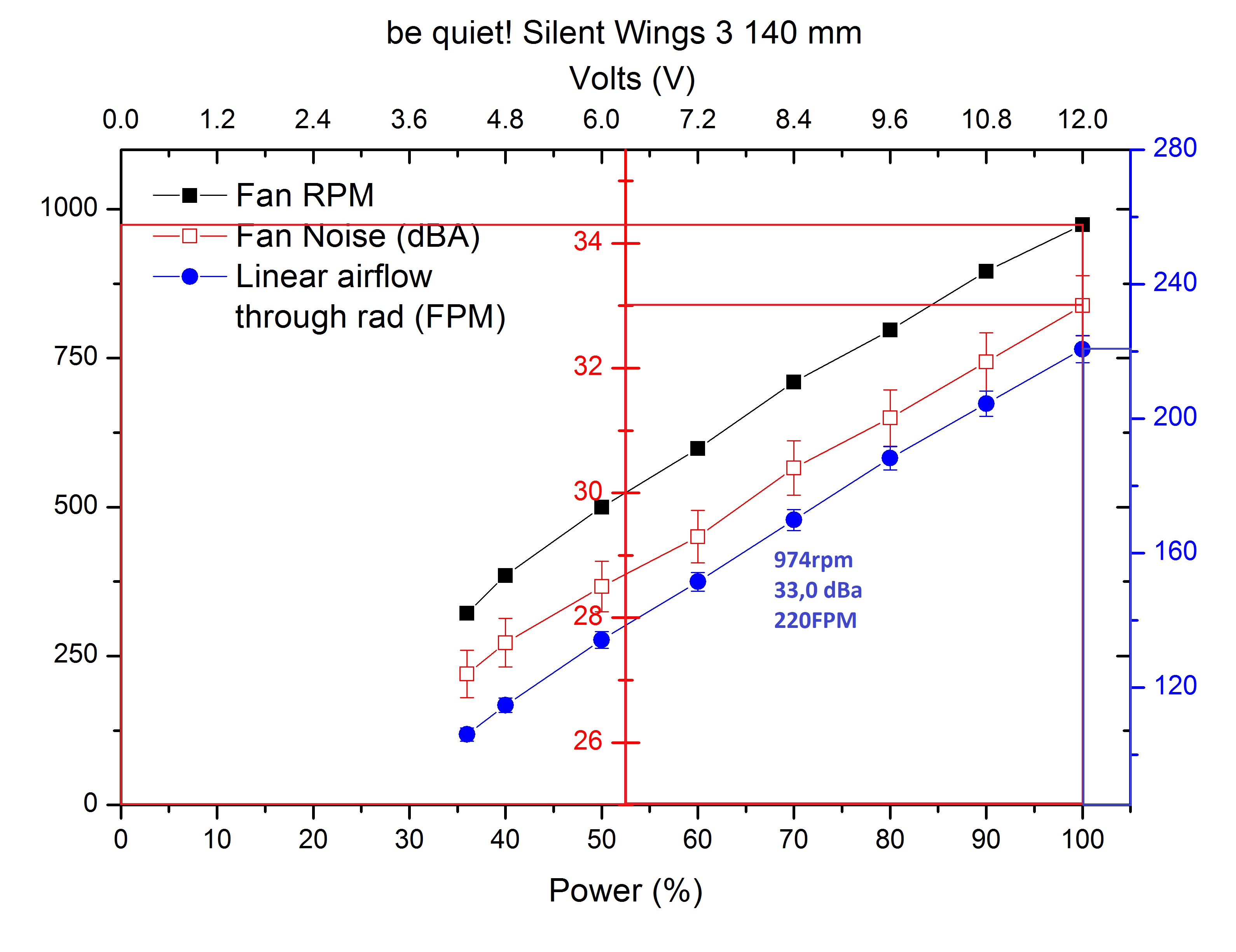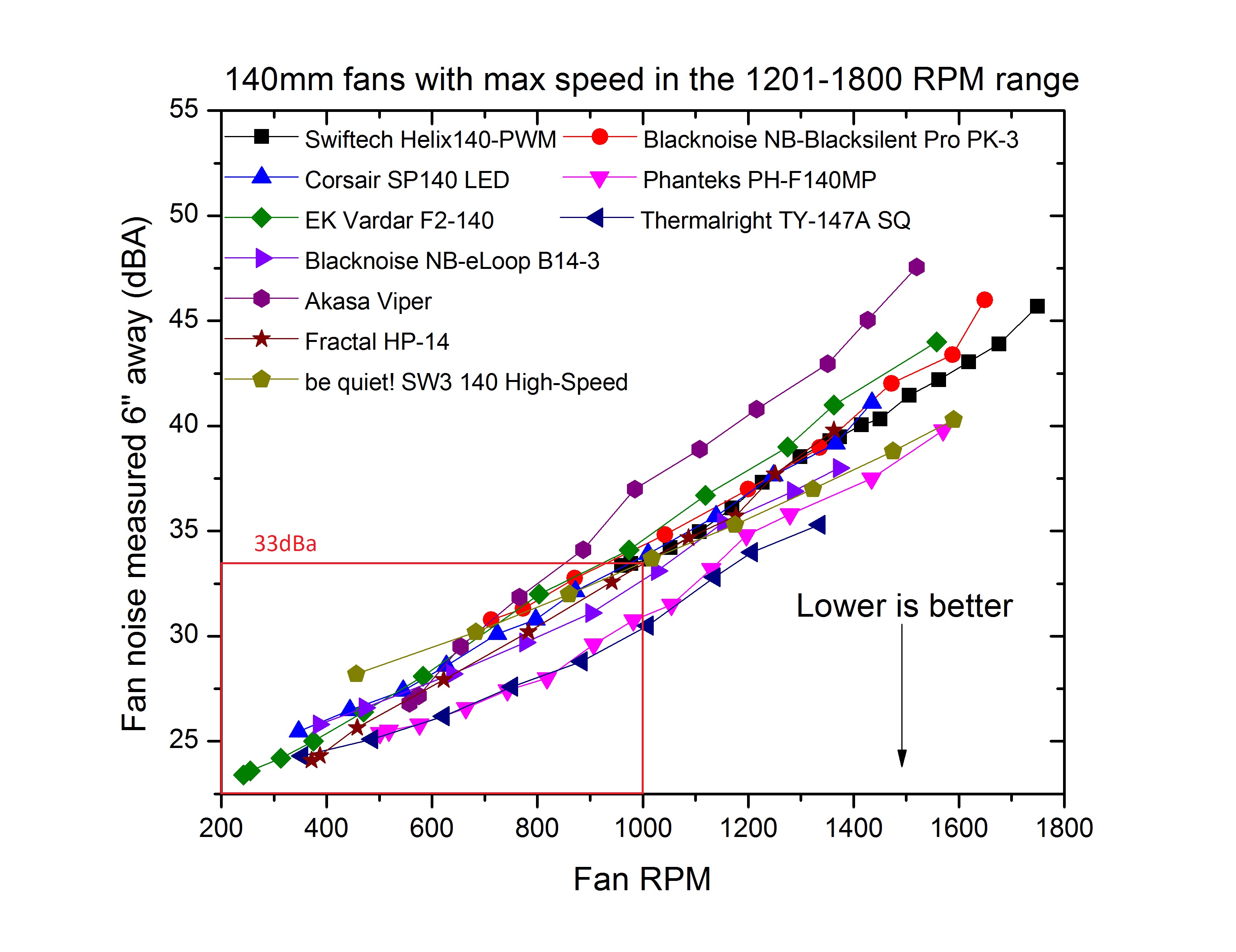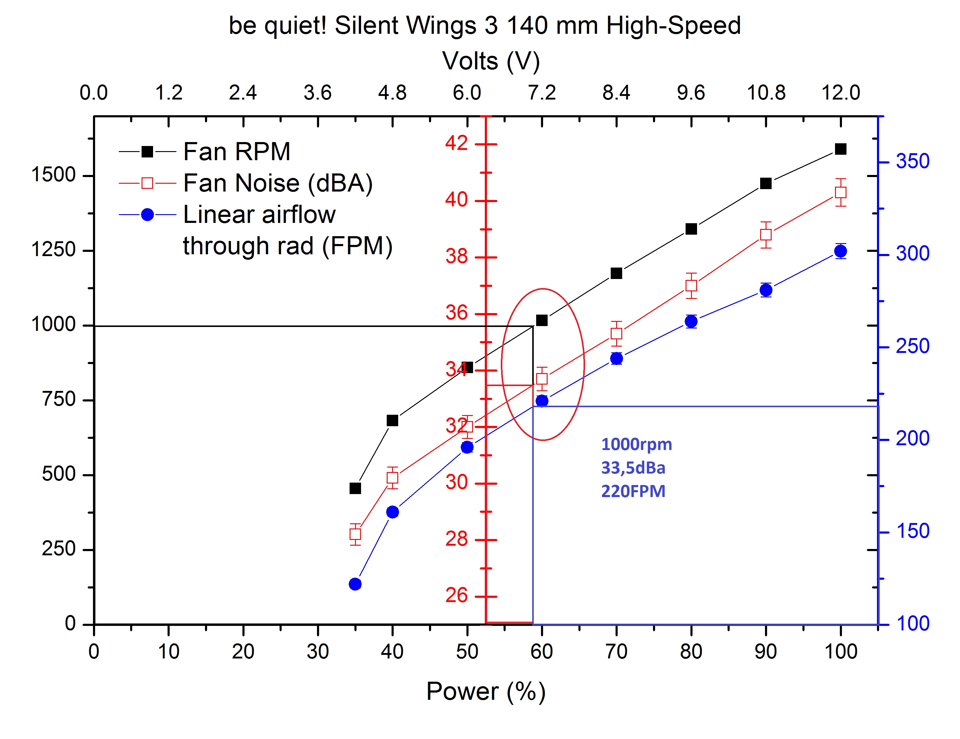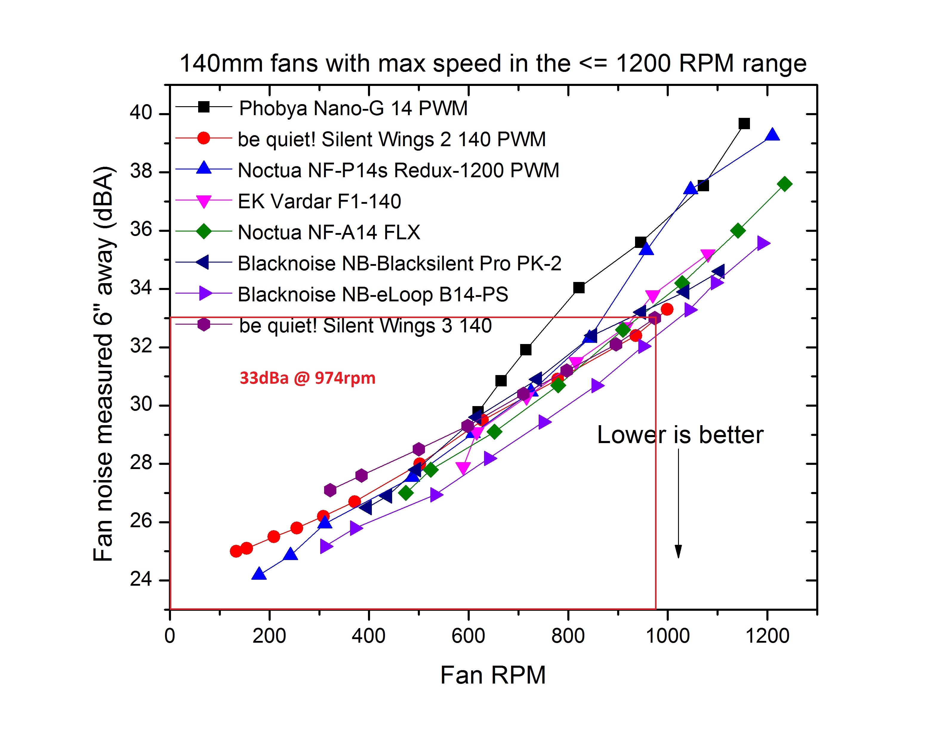 Нет, Кеша, всё не так, в том числе потому что в тесте thermalbench BL067 не достиг своих заявленных 1000об/мин а работал на меньших оборотах - 974rpm. Но самое главное что ты даже не справился подобрать два релевантных друг относительно друга графика где по оси Y будет шум а по оси X - обороты. А тот график, в котором ты проявил свои навыки paint, ты не смог правильно прочитать. Интересно, найдешь ли свою ошибку в чтении графиков сам, или мне придётся в неё тыкать?