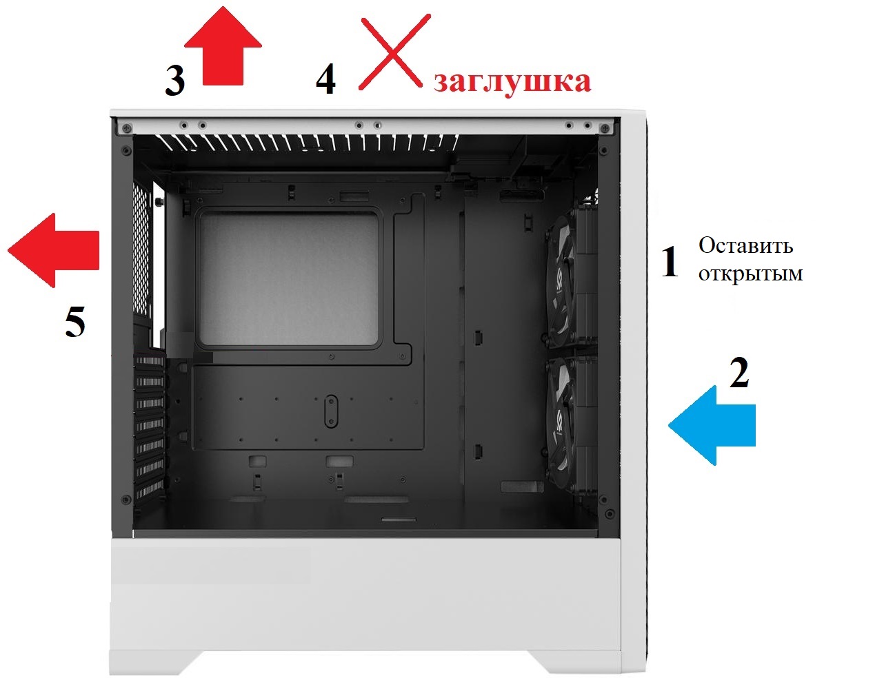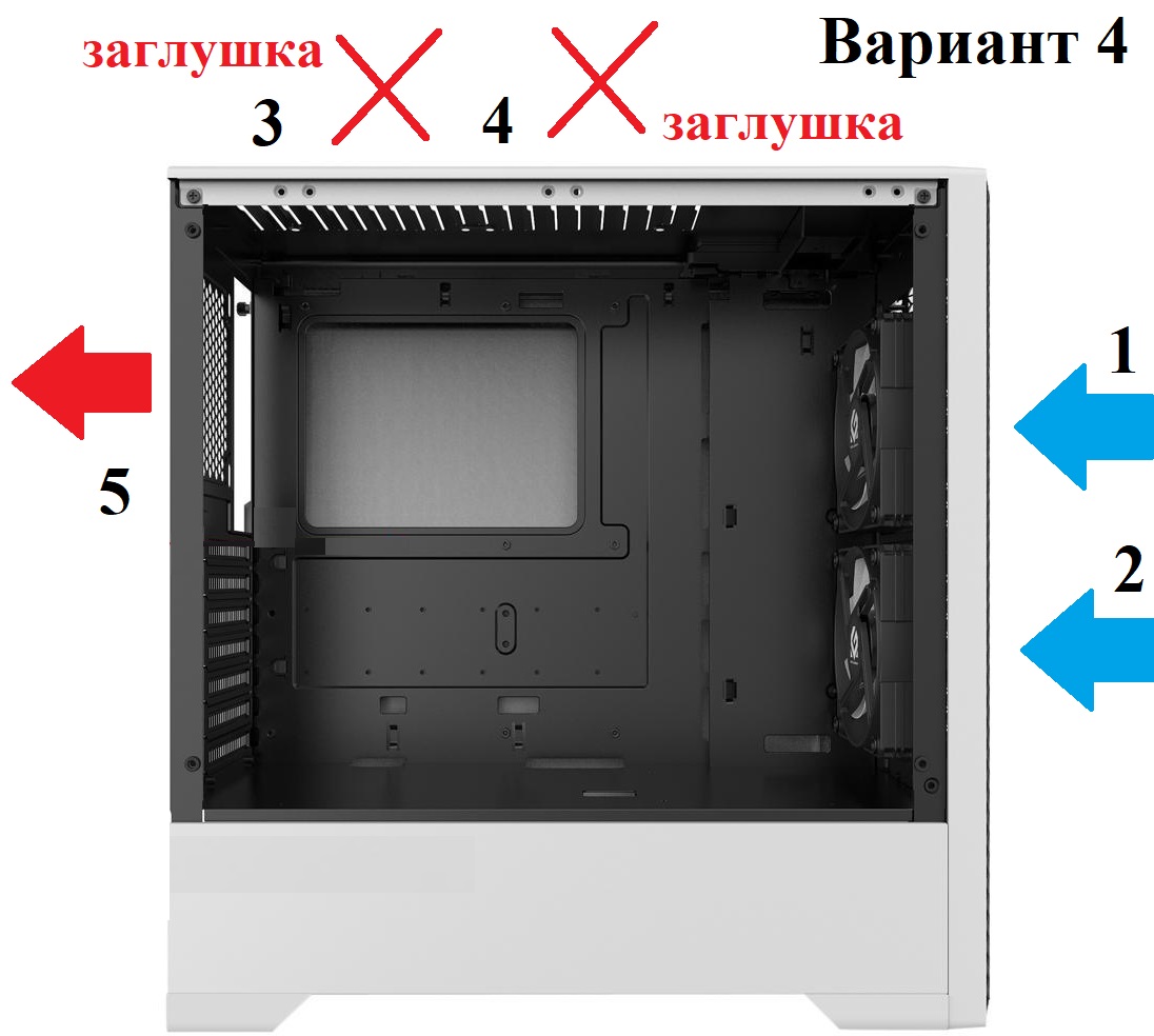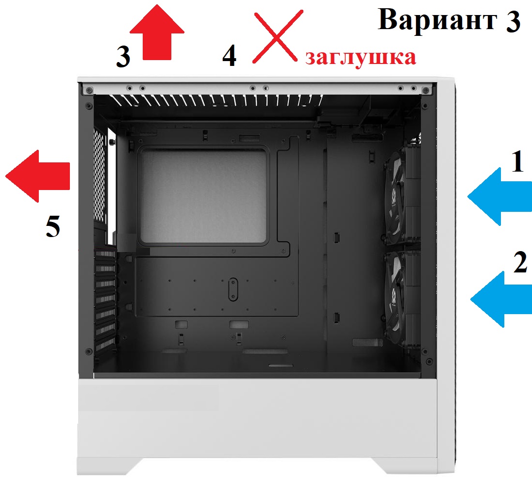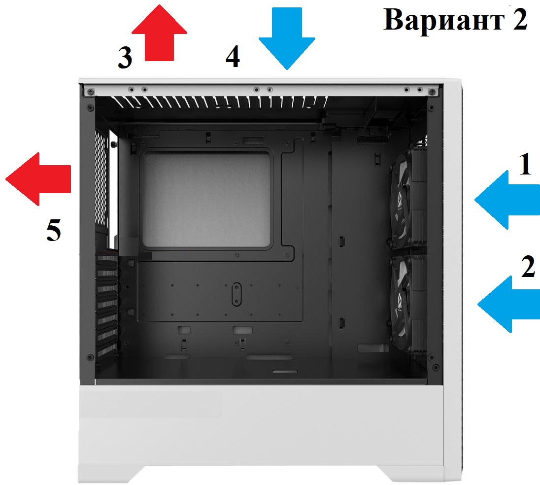 Вентиляторы обеспечивают приток холодного воздуха (обозначается синим цветом) и отток горячего воздуха (обозначается красным цветом). Их количество указывается цифрами в названиях схем.