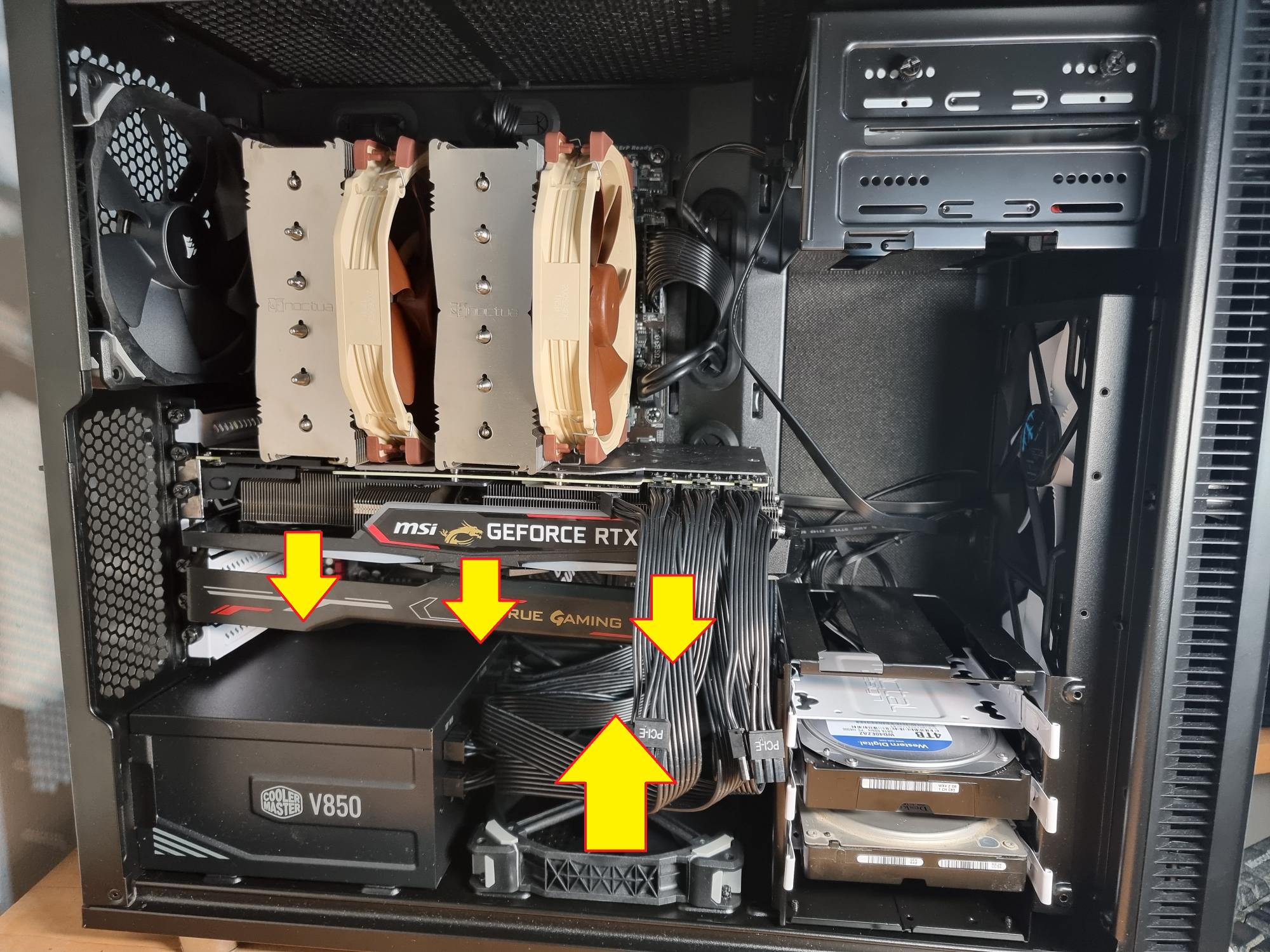Я проапгрейдил видеокарту - и возникли проблемы. Сверху карта упирается прямо в кулеры процессора. Нижний вентилятор дует прямо в "морду" вентиляторам карты. Электрические провода и клетка жёстких дисков перекрывают поток воздуха внизу. (См. фото) Что тут можно сделать, чтобы лучше охладить карту? Стоит ли отключать нижний вентилятор, или его можно как-то задействовать с пользой? Стоит ли переносить клетку жёстких дисков наверх, учитывая, что наверху она упрётся в конец видеокарты? Куда лучше убрать электрические провода от видеокарты?