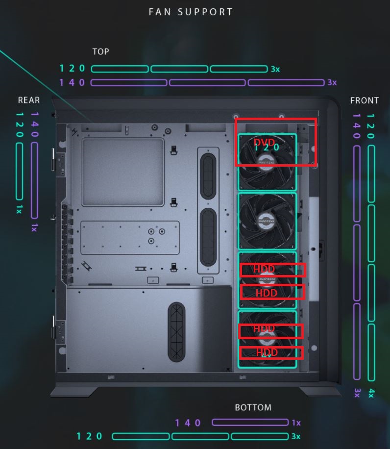 Ребята, всем привет . Планирую перебраться из профильного корпуса в Phanteks Enthoo Pro 2 TG. Помогите пожалуйста определиться с конфигурацией вентиляторов. Комплектующие профильные, охлаждение полностью воздушное. Цель улучшить охлаждение, по возможности снизить шум за счёт более хороших вентиляторов и подбора их скорости. Есть несколько мыслей и хочу понять насколько они будут результативны: 1) Насколько катастрофична для температуры видеокарты схема только с вентиляторами на вдув? Например, 3x140 или 4x120 фронт и 3x120 низ. Насколько такие схемы вообще жизнеспособны? 2) Что скажете насчёт потока воздуха снизу вверх? Что-то наподобие 3x120 низ и также 3x120 верх. 3) Подумывал об отрицательном давлении: расположенные напротив видеокарты 2x140 на вдув, а выдув задняя стенка и верх около процессора. Но тогда нужно будет что-то делать с перфорацией как на передней панели, так и вверху. Реализуемо ли это в данном корпусе вообще? 4) Есть возможность установки вентиляторов на правой стенке. Но вообще не имел дела с таким, не представляю, что можно придумать.