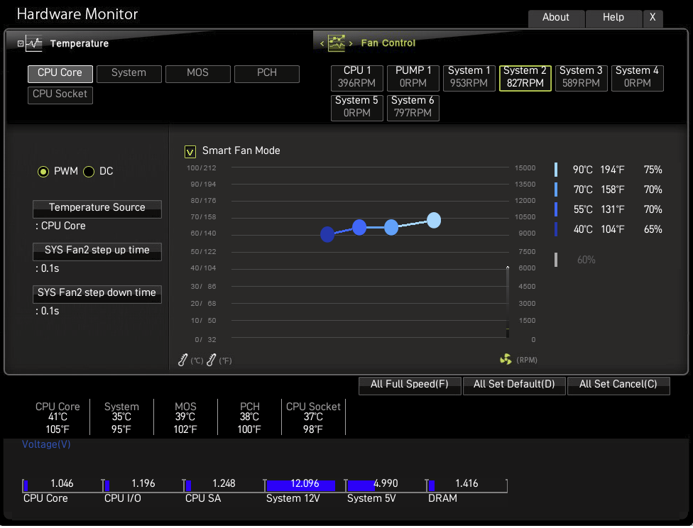 последний скрин это dragon center , я там ничего не трогал , использую для мониторинга , интересно выставить в биосе настройки вентилятора а не использовать стороние программы