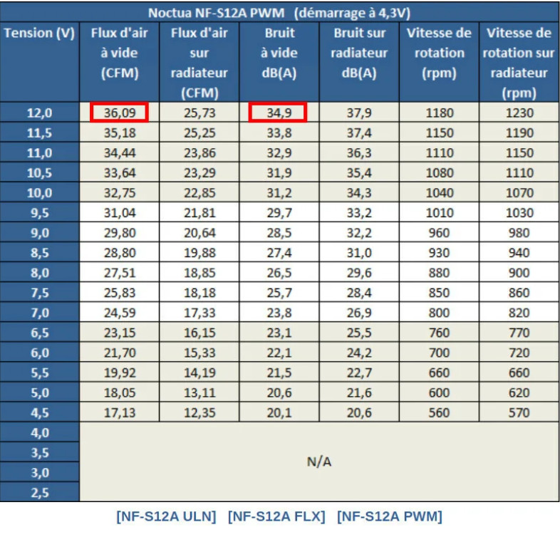 Вот тут не очень понятно. Откуда настолько отличающиеся данные по производительности в CFM у этих двух типов (16.8 и 56.9 соответственно)? Смотрю на сайте производителя, Airflow у NF-A12x25 FLX заявлено 102,1 m³/h, а у NF-S12A ULN - 74,3 m³/h, то есть довольно близко. Понятно что у первого статическое давление гораздо выше, но это наверно критично только для продувки радиатора.