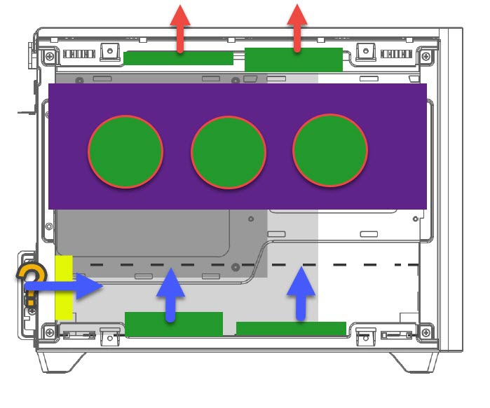 Добрый день, А здесь только про стандартные корпуса и потоки в них обсуждают? Если да, то дальше можно не читать. Если нет - то вот вопрос. Есть корпус cooler master np200r с вертикально расположенной видеокартой, примерно как на фото(из интернета). Процессор охлаждается низкопрофильным Cooler Master GeminII M5. Cнизу стоят 2 120 мм вентилятора на вдув, и 2 сверху на на выдув. Передняя стенка сплошная, левая панель стеклянная, все остальные - mesh(перфорированные). Был лишний 92 вентилятор и подходящее по размеру место - внизу, на задней стенке под видеокартой - желтым цветом на схеме. Поставил его на вдув. Почитал в шапке, что он в таком положении может мешать работе нижних вентиляторов - в "Руководстве по раскрытию...":Отдельное внимание следует уделить влиянию близрасположенных вентиляторов друг на друга, ведь это влияние может зачастую оказывать негативный эффект на их производительность.