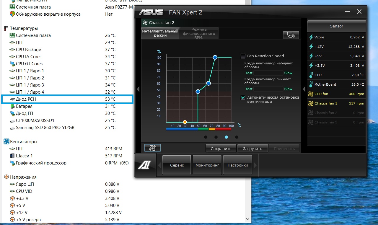 и это в простое, а в играх без бокового чипсет легко греется до 65°C. с вентилятором только до 55°C. и вентиляторы на видюхе включаются реже. наблюдал какое то время.