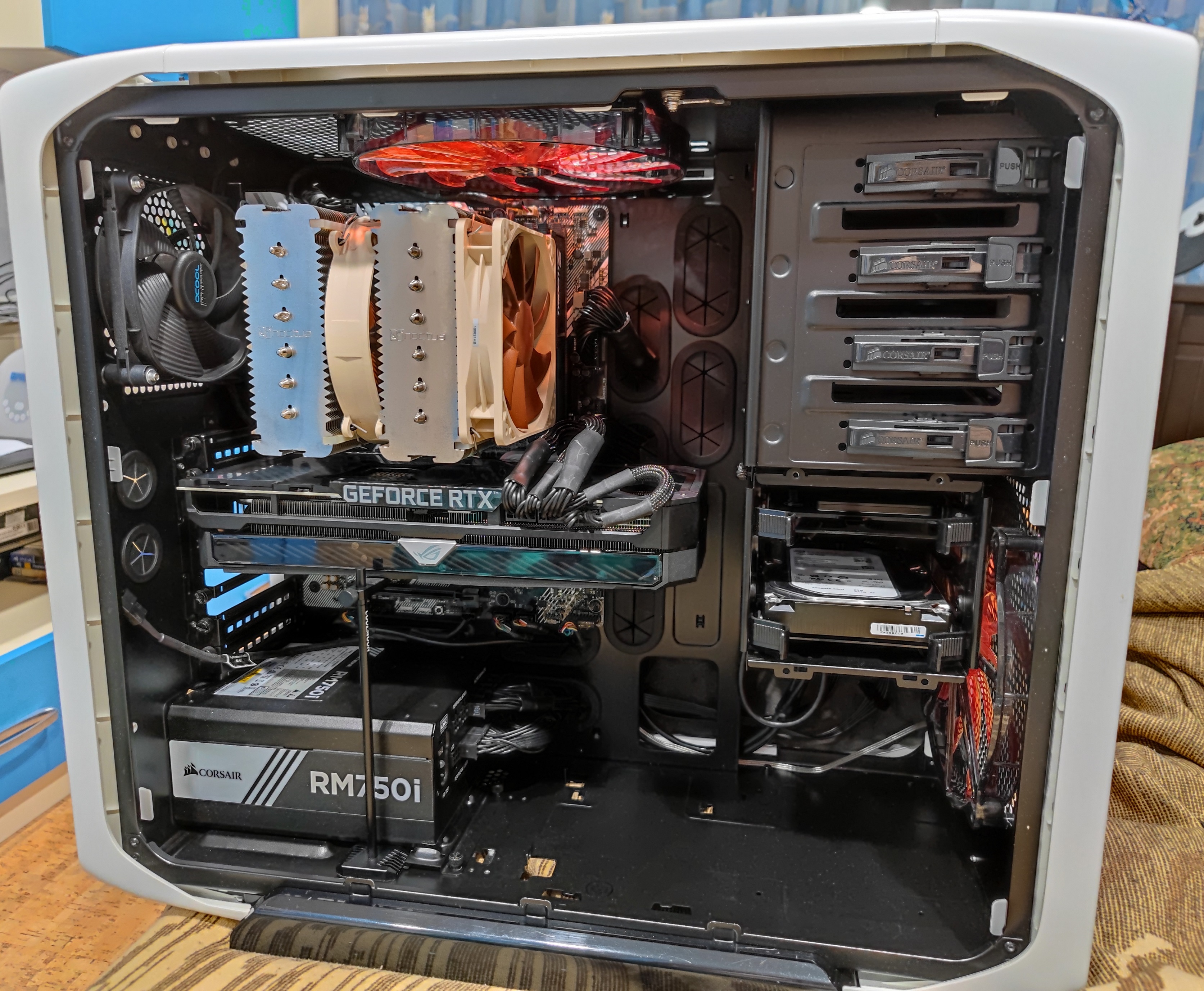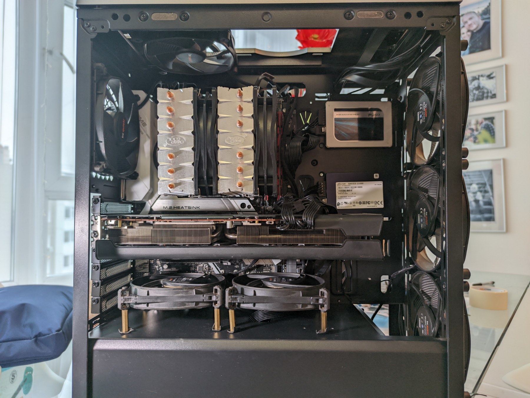 Задавал тут вопрос. Построение воздушных потоков #17798898 Итак отчитываюсь. Заменил матрекс50 на матрекс70. Выкинул из него корзину для хдд. На фронт вместо комплектных 3*cf120 поставил 3 * bl074. На выдув сзади и сзади сверху стоят пока cf120, но планирую также замену на bl074. Хотспот на ГПУ упал с 94 до 86. И это при затычном фронте в виде стекла. Также отмечу что 70 модель более продуманная чем 50я. Много что понравилось. Начиная от того что фронт вентиляторы сдвинуты назад относительно стекла, заканчивая хорошим дном у него. И это ещё вертушки пока всём работают pwm. Я думаю если под настроить, будет ещё интереснее..
