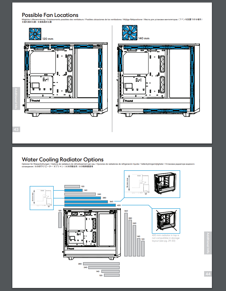 Схемы мест под вентиляторы и радиаторы СВО из инструкции к корпусу: