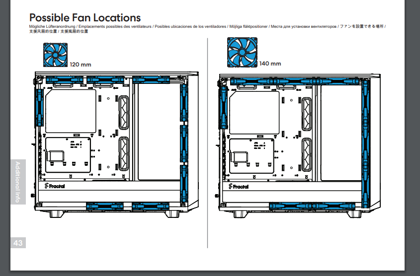 Убедили. Спасибо! В итоге 360-ую AIO буду ставить вперед, наверх 3 вентилятора 120мм, назад 140мм. Осталось определиться, как будет лучше поступить с вентиляторами снизу: 2 по 120мм, 1 на 140мм или 2 на 140мм. Посоветуйте пожалуйста. Ставить туда буду скорее всего be quiet! Silent Wings 4 или Phanteks T30 (собсно, как и наверх и назад). Картинку из мануала по корпусу прикладываю.