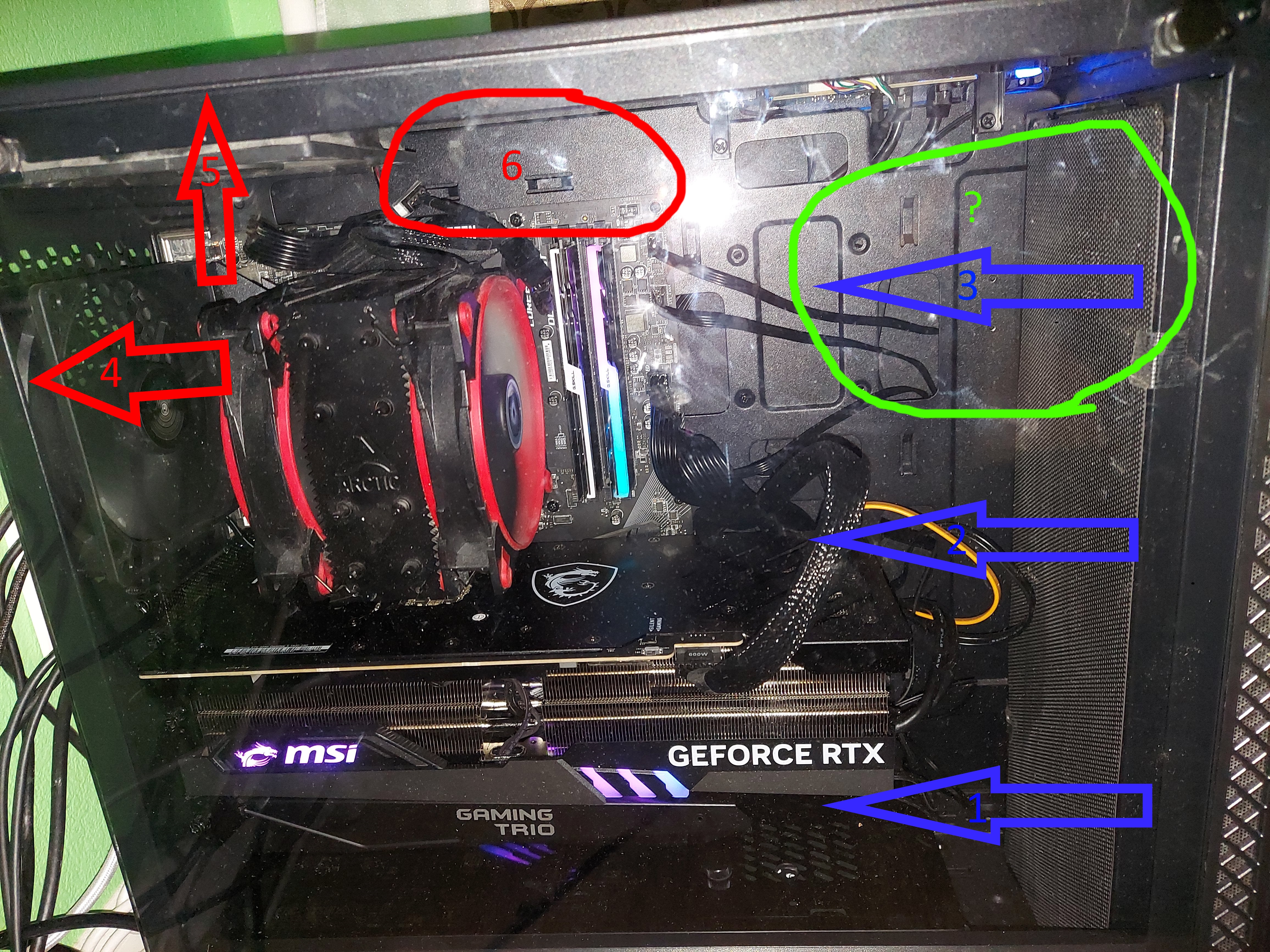 Почему-то ощущаю горячий воздух, когда ставлю руку сюда(помечено "?" на фото). Когда ставлю ещё один 120мм вентилятор сверху на выдув(цифра 6) температура либо такая же, либо выше. Блок питания стоит вентилятором вниз(внизу нет ковра и корпус позволяет). Пробовал снимать пылевой фильтр - ситуация такая же, изменений не заметил.