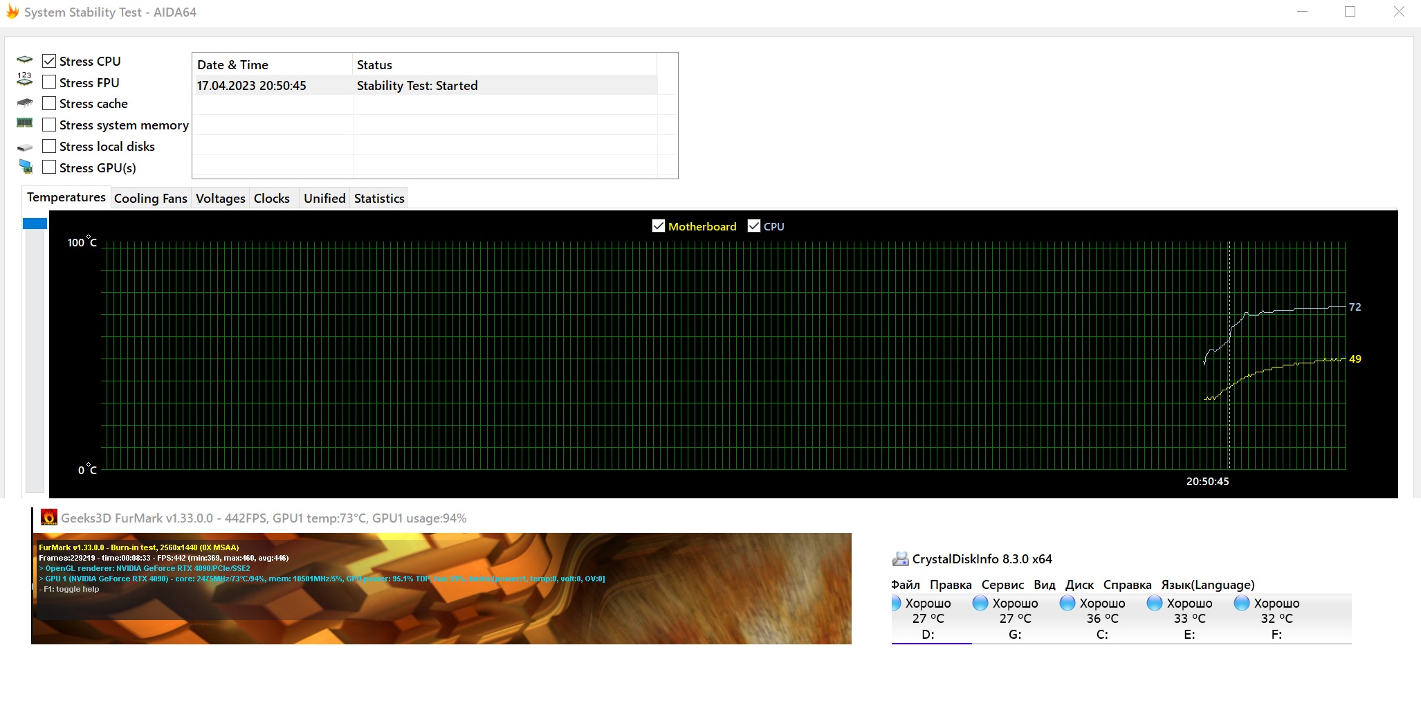 Видеокарта 73 градуса в нагрузке(почему-то выше 95% не поднимается) после 8 минут теста. Процессор 71 градус в нагрузке. Память 41 градус при этом. ЖД\SSD не греются вообще(в том корпусе мой основной SSD был около 50 градусов)