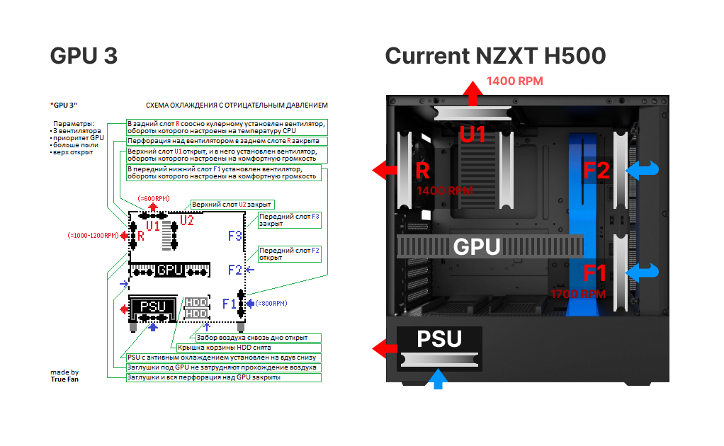 Схемы с отрицательным давлением (лучше для охлаждения GPU, больше пыли):