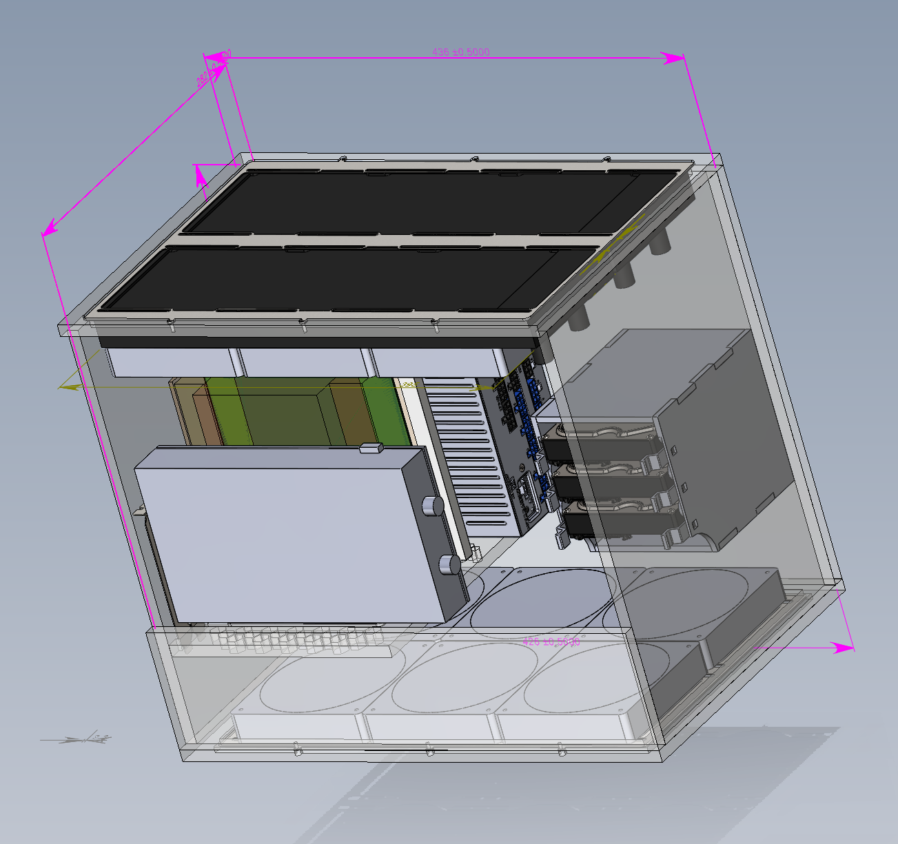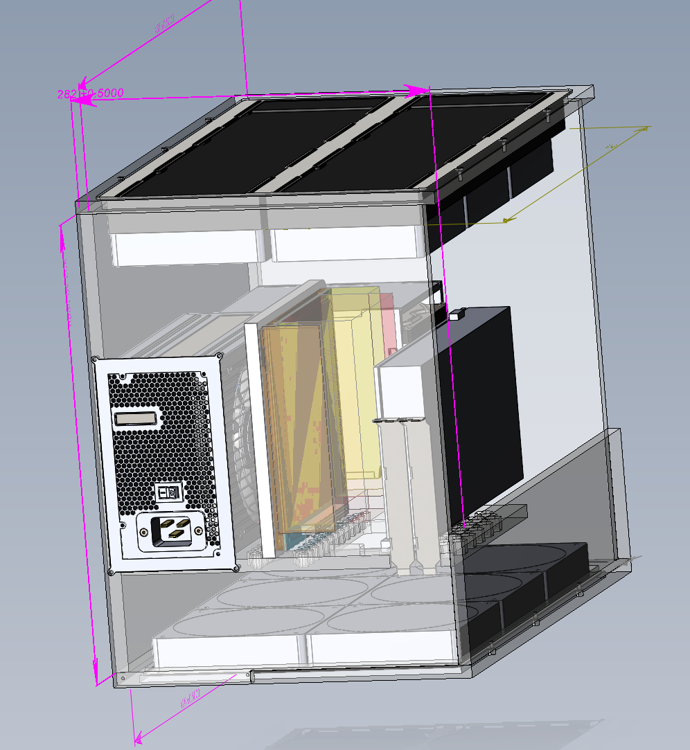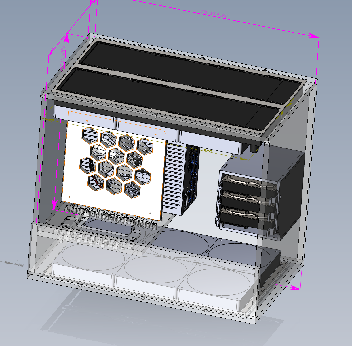 Здравствуйте, строю вот такой корпус, сверху два радика необслужки на выдув. Один от вк с водянкой GIGABYTE GeForce RTX 3090 TI AORUS XTREME WATERFORCE, Второй на проц Xilence Performance A+ LiQuRizer LQ360. Нормальных данных по их вентилям и радикам не нашел. Радики вроде похожие один померял, перенес в солид, общая площадь продуваемых отверстий ~20775mm^2 это около 57% от общей площади примыкаемой поверхности к вентилям Снизу на вдув планирую поставить 6x Iceberg Thermal IceGALE Xtra 120mm они у меня есть, но принимаются и другие предложения. На процессорный радиатор, конечно можно поставить другие вентили, а вот на радиатор видеокарты только через колхоз.