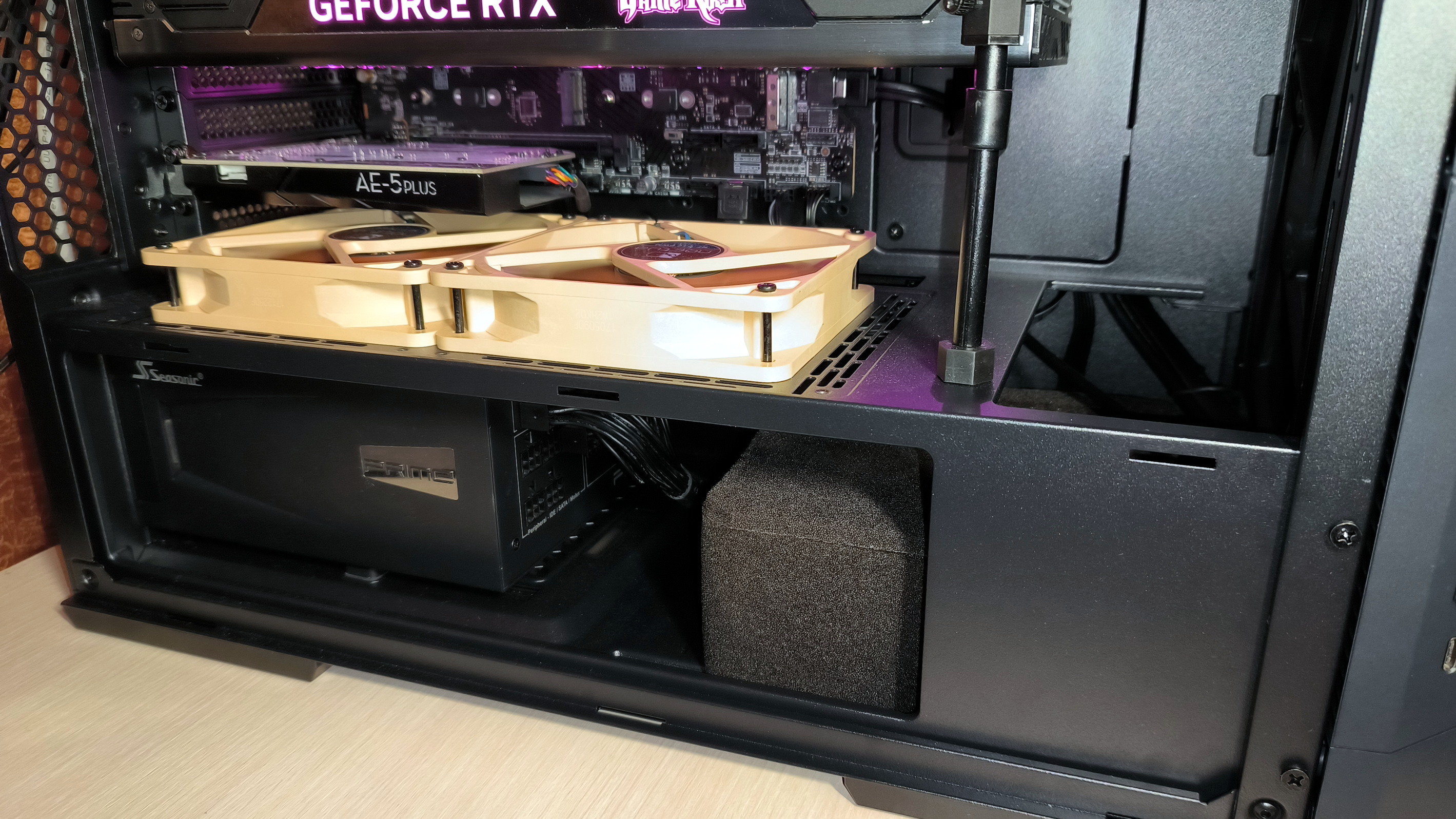 Как мало? Там же по всему дну крупная перфорация, и за счёт ножек, высота пространства от стола до нижнего пылевого фильтра примерно 1,5 см. Плюс там не только на кожух БП можно ставить вентиляторы, но и на само дно. И на дно можно даже 140 мм вертушки установить.