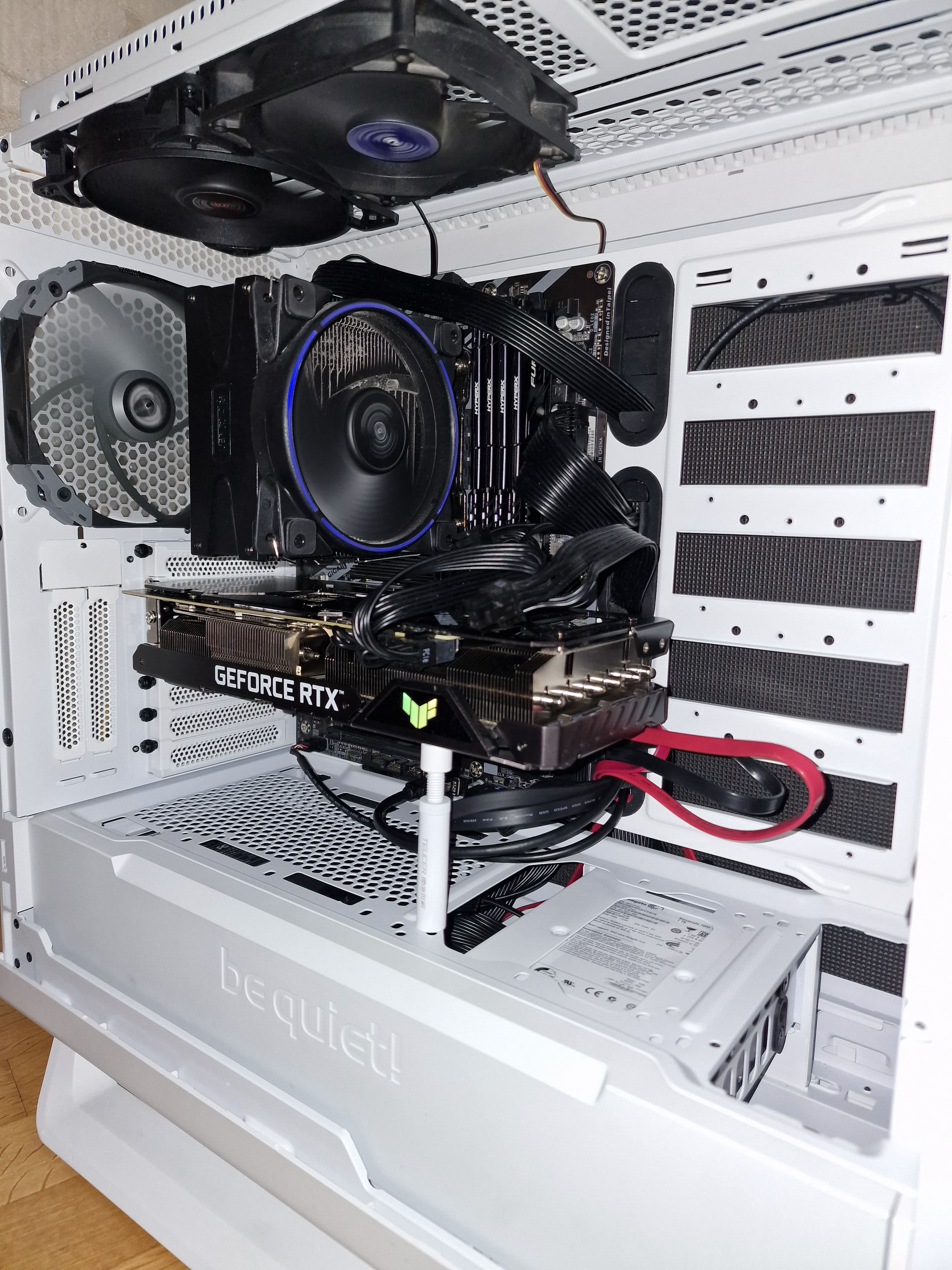 Знатоки, прошу помощи, хочу сделать систему холоднее и тише по возможности, дано: Корпус: Be quiet Silent Base 802 Вертушки: спереди Be quiet Pure Wings 140 3шт, основной тыл Scythe Kaze Flex 140 и сзади выдув вверх 1шт Be quiet Pure Wings 140 Процессор: Ryzen 5700X с кулером PCCooler gi-x6 (с температурой проблем никаких, шум в целом терпимый) Видео: RTX 3080Ti ASUS TUF (вот тут основная проблема, при нагрузке и потреблении выше 200Вт либо высокие температуры либо вертушки уже шумят оч сильно), балуюсь рендером видео, плюс начал изучать ИИ, часто на ночь приходится в нагрузке оставлять машину, давит на уши.