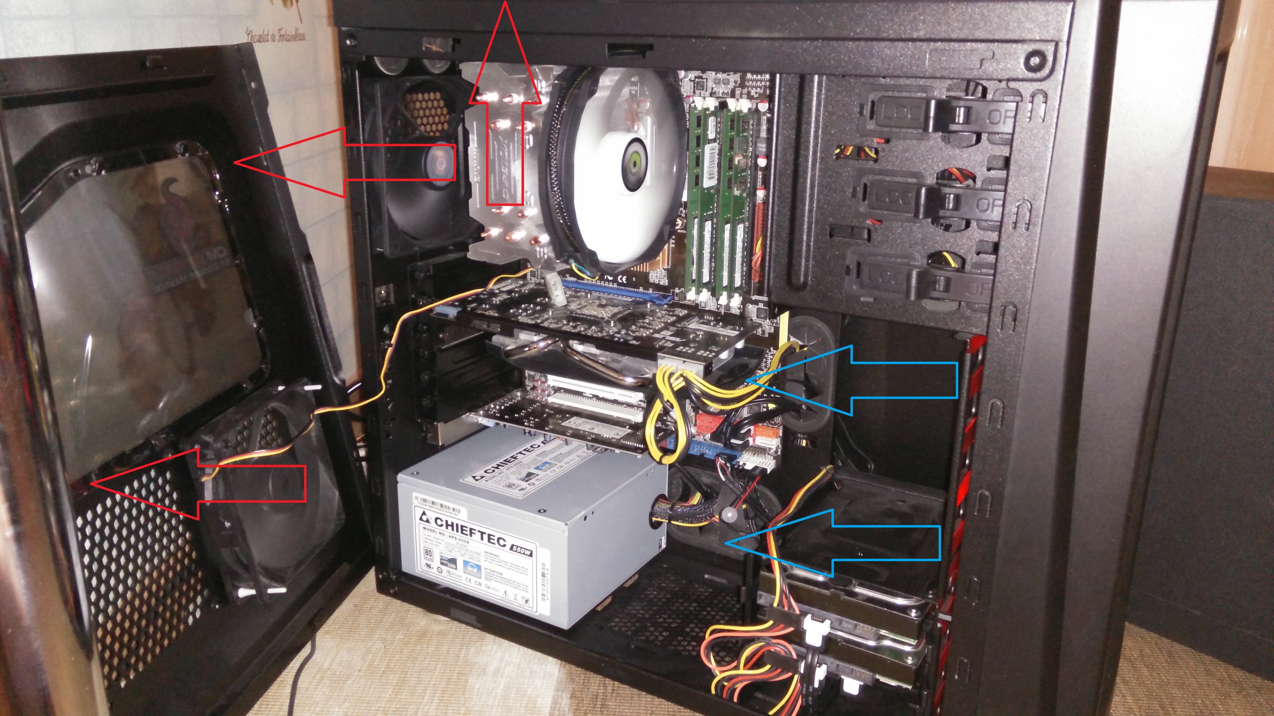 Sabotender от самого нижнего фронтального, потоку препятствует 2 HDD и 1 SSD, а верхний дует ужа над ВК. снизу будет дуть как раз под ВК, а тот, что на крышке будет эту смесь отводить ......