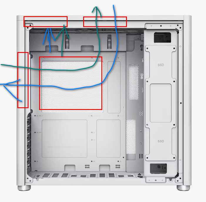 Проц 14700к, карточка 4070ти, в будущем планирую менять на 5080 Хочу её полностью запичкать вертушками, а именно: два 200мм спереди на вдув, три 140мм снизу на вдув, три 140мм сверху на выдув, вертикальная СЖО с тремя 140мм с боку на выдув и один сзади 140мм на выдув(нужен ли?), возможно ещё буду ставить охлад на озу в виде ALSEYE две вертушки по 60мм, т.к. планирую гнать её, но с таким обдувом может и не понадобится, не шарю пока) Видеокарту планирую ставить вертикально через райзер