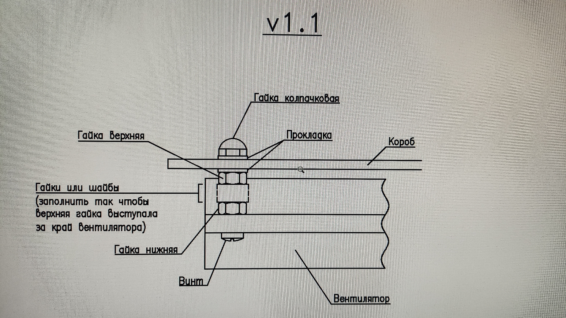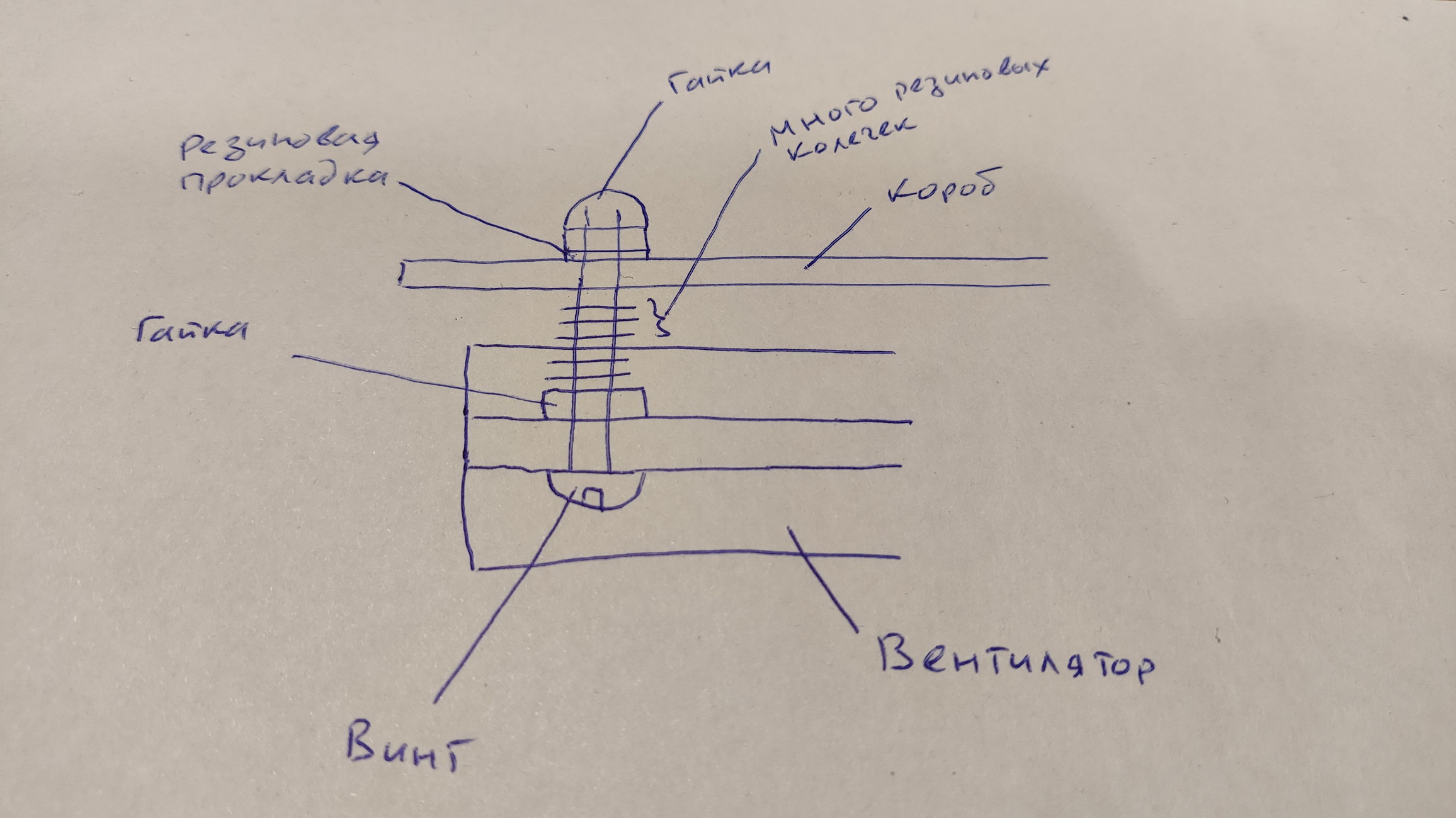 Если на винт надеть много колечек, чтобы они были выше края вентилятора, то при аккуратной затяжке сверху можно сделать так, что вентилятор не будет касаться короба, но при этом за счет упругости этих колечек будет достигнута необходимая жесткость чтобы вентилятор не болтался.