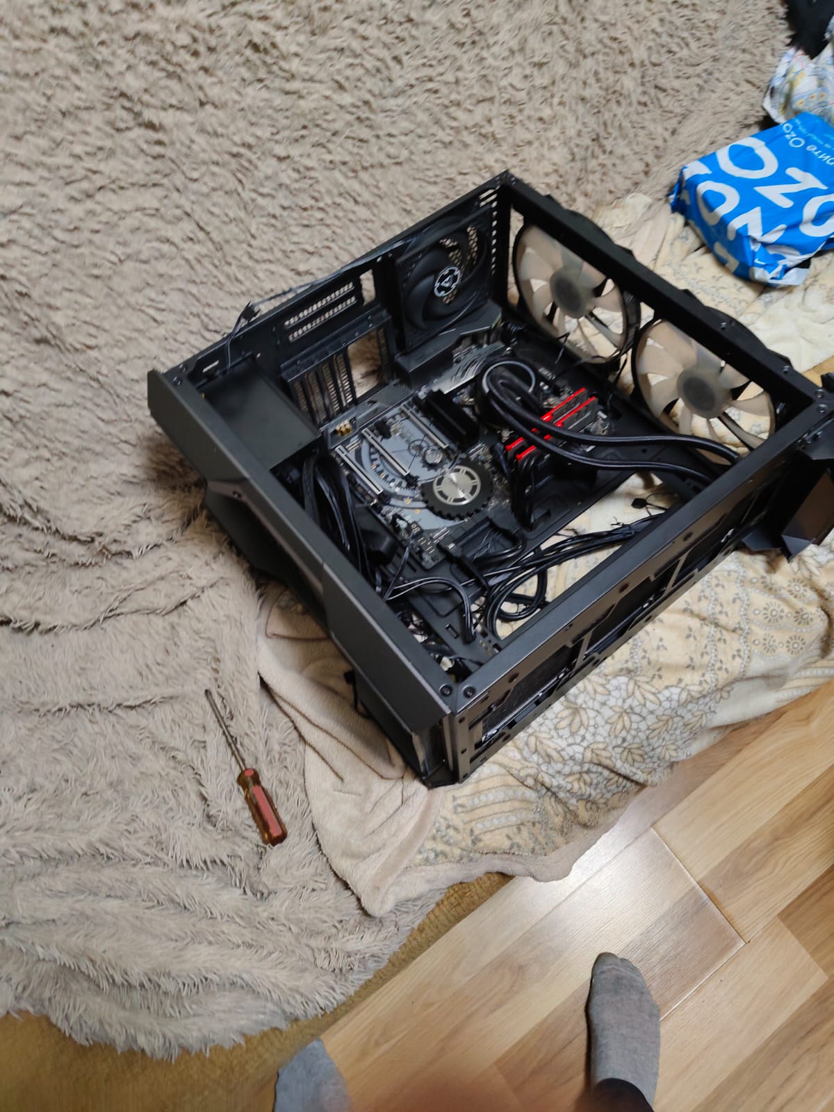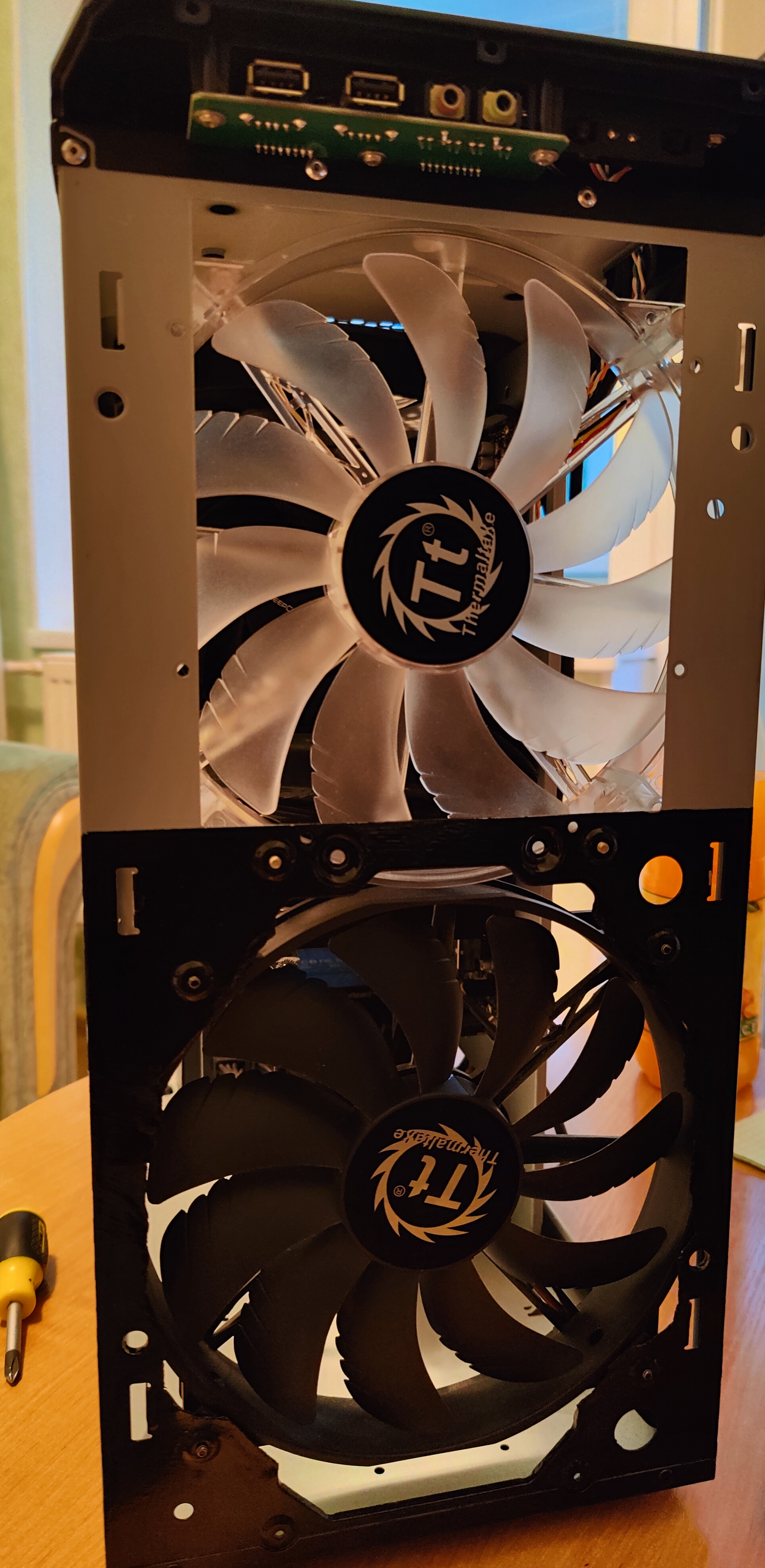 Короче последовал я вашему совету, собрал на морде, это пипец хочу вам сказать, передняя решетка изогнутая, через неё вентили не прикрутишь, болтов не хватает пришлось городить бутерброд внутри, да и зазор был бы очень большой, прикручивая это всё через решетку, навыки проктолога очень бы пригодились, жаль не обладаю, сверху наоборот 200ки внутрь не влезают, только снаружи крутить, ну и в итоге их снутри не видно сверху обратной стороной, да и ещё вся порнография над матерью оголена, ну и главное нижний вентиль упирается в корзину с хдд, это прям по мне не нормально, хоть отказывайся от такого рудумента.