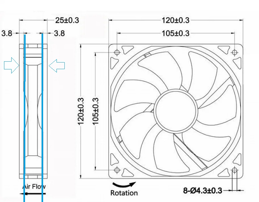 Вентиляторы обеспечивают приток холодного воздуха (обозначается синим цветом) и отток горячего воздуха (обозначается красным цветом). Их количество указывается цифрами в названиях схем.