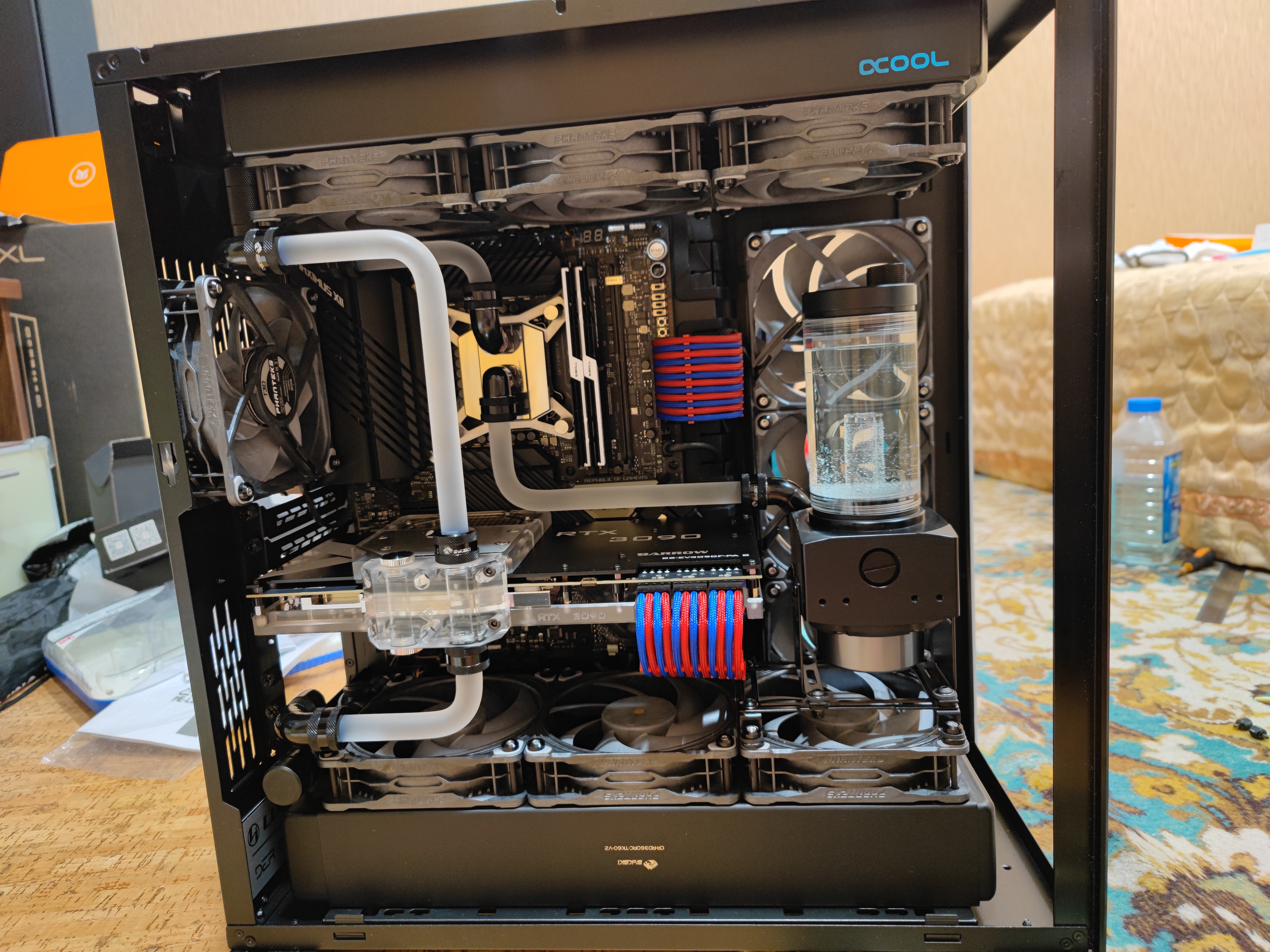 Это не 2 раздельные АИО проц\ВК. Это кастом (если я верно понимаю), и 2 радика в одном контуре, поэтому нет никакого отдельного тепла от цп и отдельного от вк. Второе, жижа довольно горяча в нагрузке, точнее даже, количество тепла в секунду от радиаторов много больше, чем от остатка тепла внутри корпуса после снятия оного водоблоками. Поэтому радиаторы в полном кастоме всегда должны быть на выдув из корпуса, а другие фены должны подавать холод снаружи.