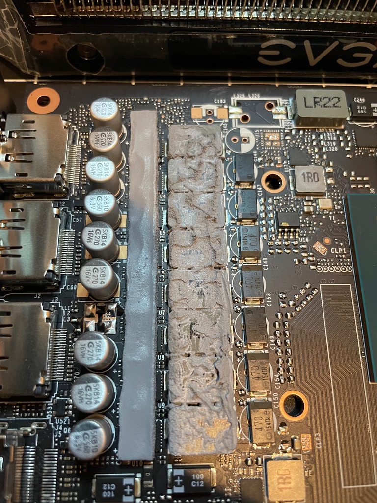 Что это меняет если она высохла как и термопаста на чипе в сухарь?вот поставил 0,5мм прокладку,Эвга даже это позволяет,я лучше по старинке, советую ее сразу менять стоит 10 баксов такая штука не известных спек Thermal Putty for EVGA GeForce RTX 30 Series VRM, 8g сразу в мусорку я занимаюсь доводкой инструментов иногда,знаете то же модного много чего,а вот вековые методы из книжек самые лучшие