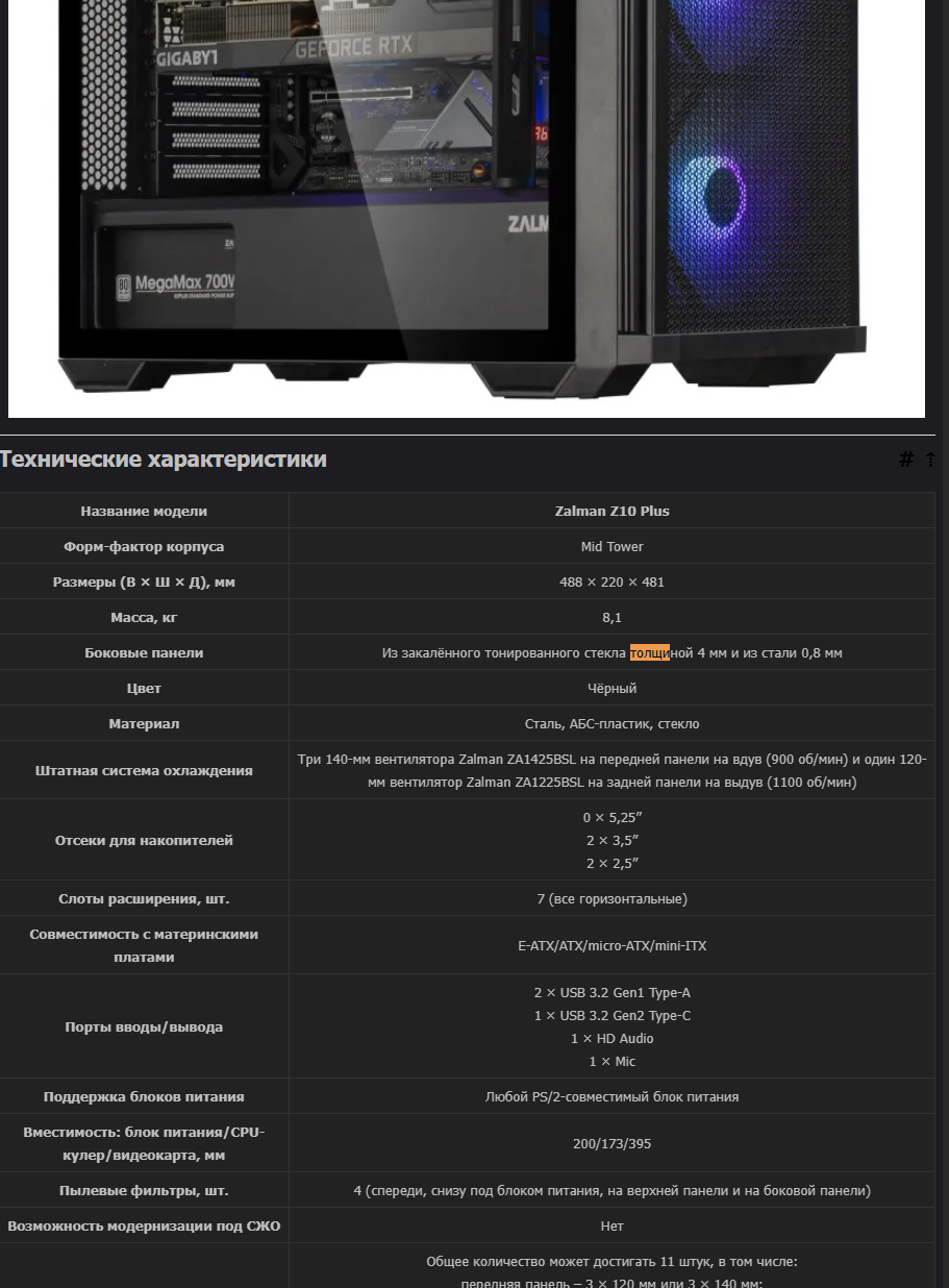 Действительно удивлен, в спеке, на коробке вес корпуса 8кг, а у евреев дается масса 9.5кг (похоже вес с упаковкой)У евреев Weight 9.5kg, у Zalman Weight 8kg. И я должен верить этой лживой, еврейской помойке? Еще раз для непонятливых, у меня этот корпус в метре стоит, а ты ссылаешься на еврейский источник, который мало кому известен, потому, как Z10 в руках не держал, в отличие от меня.