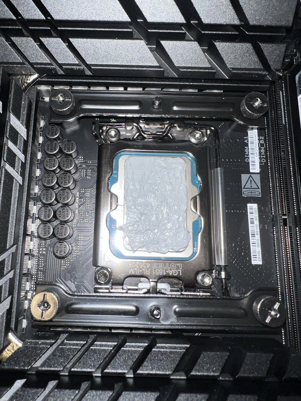 Обзоры обещали удобное нанесение по аналогии с MX-4. ЩАС! У меня в помещении около 24 градусов, камень в сокете, все обезжирено, дополнительно светит лампа на материнку и процессор, чтобы точно-точно нанести. Термопаста такой температуры, как и помещение. Выдавливаю вертикальну полосу, начинаю аккуратно пытаться размазать ее по поверхности процессора, и тут(!) паста начинает собираться обратно в шарик. Она вроде бы прилипает к лопатке, даже тянется, но как будто не может прилипнуть к поверхности камня, и комкуется. Приходит мысль: взять обычный фен, не строительный и погреть пасту несколько минут. Она становится немного эластичнее, при создании тонкого слоя на камне она начинает немного твердеть, цепляться. Размазать ее, как MX-4 - забываем сразу, такой экономии и тонкого слоя НЕ БУДЕТ. Начинаю аккуратно лепить этот слой. Экономично? Неа. Не хватает полоски, подкидываем еще капельку, за ней еще капельку - и так до победного.