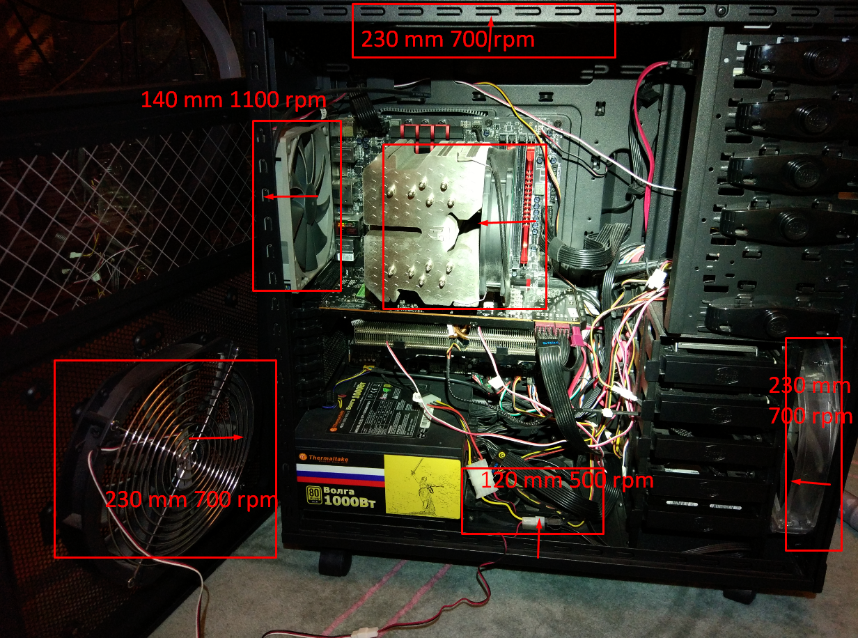 ekzoman Спасибо. У меня фильтры, которые идут в комплекте Thermaltake Chaser A71 Не подскажете как оптимально распределить потоки? Сейчас настроено так: спереди 200мм@600rpm вдув, сверху над процессором 200мм@600rpm вдув(через фильтр из какого то сетчатого материала наподобие поролона); сзади 120мм@1200rpm zalman zm f3 FDB на выдув, сбоку 200мм@600rpm на выдув(тоже через фильтр пока работает из материала наподобие нейлона) и снизу 120мм@1000rpm на вдув(фильтр из материала наподобие нейлона). Изначально в корпусе было сбоку на вдув а сверху на выдув. P.S. На кулере True Spirit 140 Power(он развернут на 90 градусов) вентилятор стоит под 200мм@600rpm работающим на вдув. Корпус Thermaltake Chaser A71