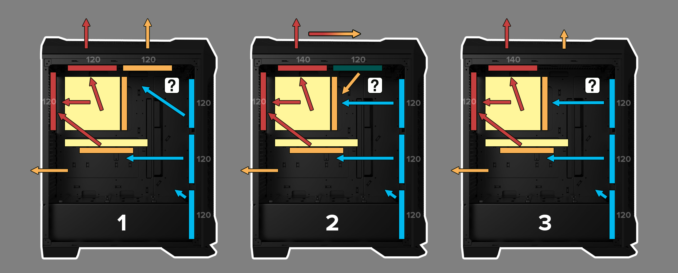 Вентиляторы обеспечивают приток холодного воздуха (обозначается синим цветом) и отток горячего воздуха (обозначается красным цветом). Их количество указывается цифрами в названиях схем.