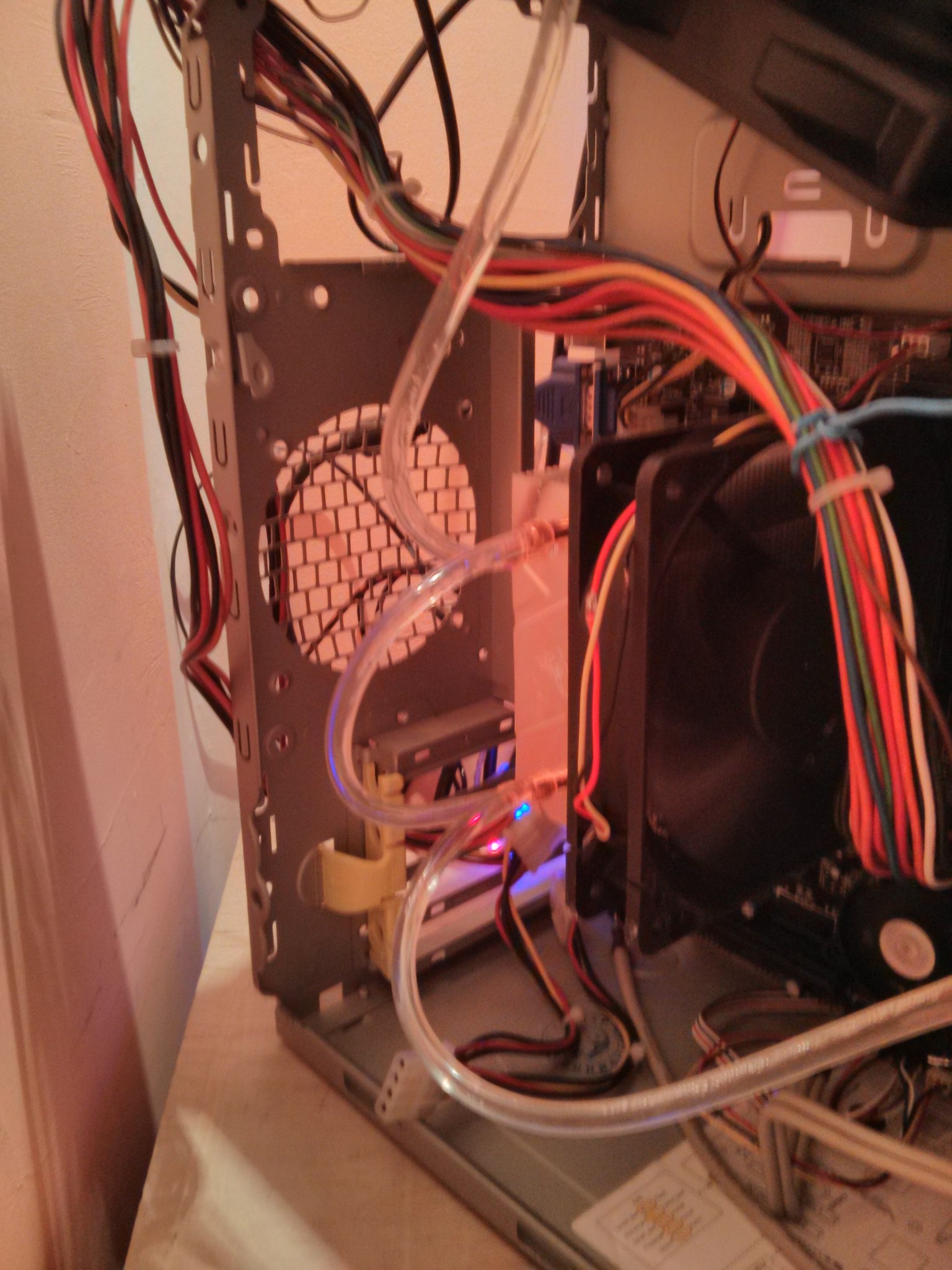 Такая вот приблуда получилась. Трубки из зоо-магазина, соединены последовательно (параллельное подключение не затащила помпа). Кулер U-образный, две трубки. Изначально планировал сделать на ZALMAN < CNPS8000B> (4 трубки), но ближе к подключению я понял, что погорячился и зря изнасиловал дороговатый кулер (концы трубок там на столько близко расположены, что нельзя к ним подключиться). Относительно результатов могу сказать, что U-образный с водой стал на один уровень (а при нагрузке и первом включении в биосе - даже лучше), чем обычный ZALMAN < CNPS8000B>. Конкретные температуры не могу привести, т.к. U-кулер я давно не использовал (ибо он не очень и пришлось его цеплять ток потому, что угрохал залман вышеупомянутый).