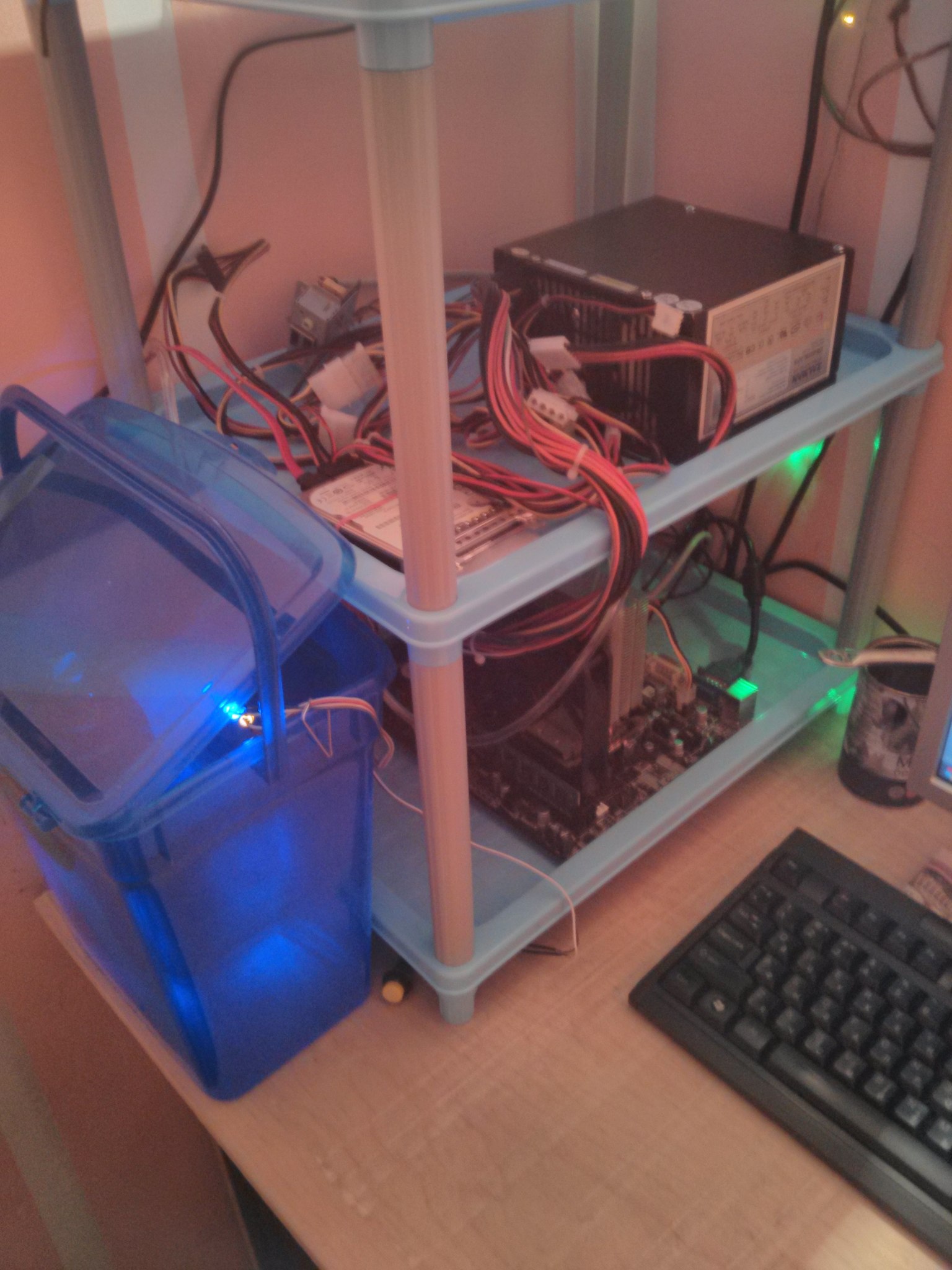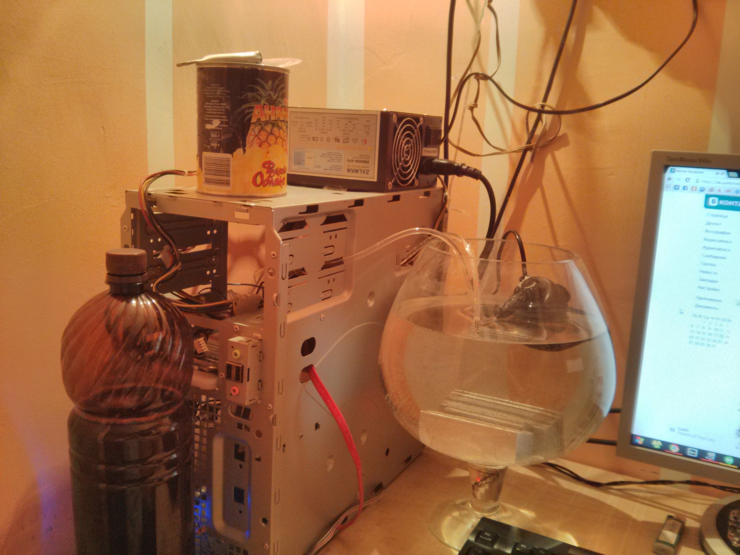 В данный момент лишь приобрёл новый трёхтрубочный залман, который идеально подошёл под хорошие крепления от испорченного залмана (крепления типа качель, особенно если мать расположена вертикально - полная хрень), полочку, на которой мать по ширине легла почти идеально (под матерью налепил маленьких радиаторов, чтобы она не прилегала вплотную к пластмассе), ну и ведро, изначально предназначенное для хранения порошка стирального. Осталось пожалуй купить помпу по мощнее и можно будет лепить всё это дело. С другой стороны - пока ещё не решил, стоит ли оно того, ибо денег потрачено столько, сколько хватило бы на магазинную СВО, но, всё что с магазина - нам не интересно и легких путей не ищем.