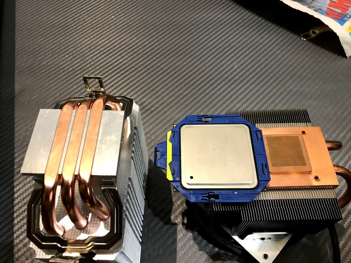 Есть Xeon E5 2640 - это такая большая дура на LGA2011. И есть у меня кулер, рассчитанный под LGA1366. Судя по информации в интернете, по размерам крепления 1366 и 2011 идентичны, а размеры процов подобны. Заводом-производителем, отдающем себе отчёт о размерах процов в 1366, была предложена площадь соприкосновения медного основания с крышкой ЦП (на глазок) примерно около половины от всей площади крышки (если не меньше). Вопрос очевиден: В ТЕОРИИ будет ли страдать эффективность охлаждения от неполной площади соприкосновения с крышкой ЦП? НА ПРАКТИКЕ проверить своих подопытных пока не могу, ещё не заказал мать под всё это. Содержимое E5 2640 под крышкой я не нашёл, что бы прикинуть площадь самого кристалла. Да и врядли найду, т.к. вроде бы как это поколение процов идёт с припоем под крышкой и оторвать оную без повреждений кристалла нельзя. На фотках в сравнении мой куллер для 1366 и универсальная башня.