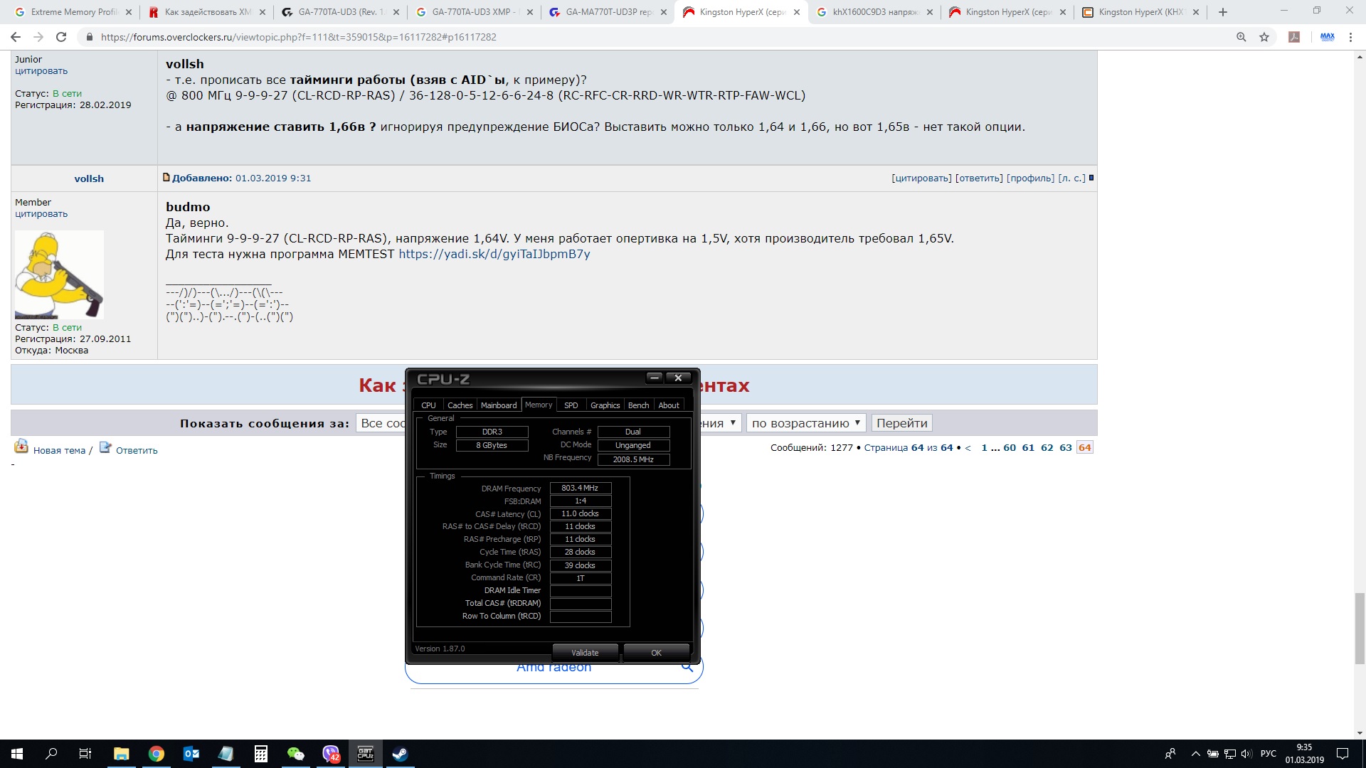 budmo Да, верно. Тайминги 9-9-9-27 (CL-RCD-RP-RAS), напряжение 1,64V. У меня работает опертивка на 1,5V, хотя производитель требовал 1,65V. Для теста нужна программа MEMTEST https://yadi.sk/d/gyiTaIJbpmB7y