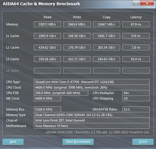 4770K @ 4400 MHz, 4*4 Gb Hynix HMT351U6CFR8C-PB 1600 MHz (11-11-11-28, 1.5 V) Гнал сначала на 3770К @ 3900 MHz прошла мемтест 2400 MHz (11-13-12-35 1.69 V) На моем 4770К при вышеупомянутых характеристиках процессора на 2400 нивкакую не заводится, ни при каких условиях, в итоге выдавил из нее 2200 MHz (10-12-11-28 1,66 V), при таких условия 6 часовой мемтест показывает 0 эроров линкс проходит тоже хорошо