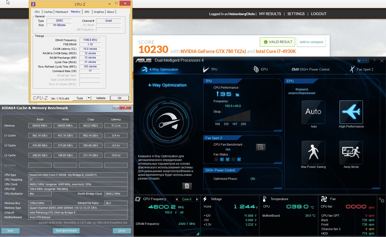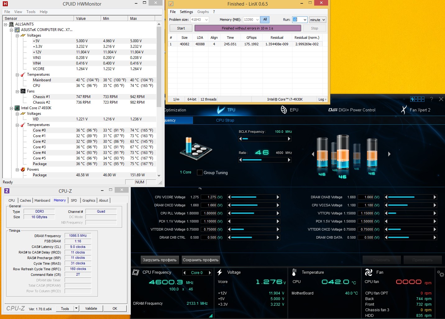 Будь проклят тот день, когда я купил G.Skill Имеется G.Skill F3-19200CL11Q-16GBZHD XMP 2400 11-11-11-31-2T 1,65V VCCSA 1,2V 4930k и Asus X79 Deluxe Максимум что я смог выжать при 46*100, Offset +0.040, VCCSA 1,18V, VTT 1.15V, PLL auto, LLC Medium, CPU CC 130%, VCCSA LLC Auto, VCCSA CC 130%, DRAM CC 120%, DRAM Power Phase Control Optimized это 2133 9-11-11-31-2T 1,65V