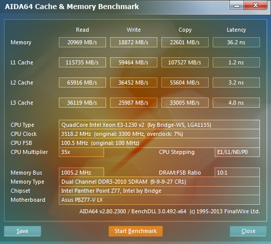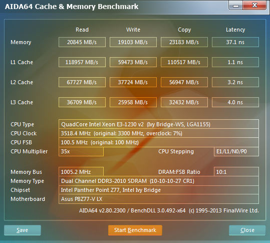 Разгоном не занимаюсь особо. В основном все компы работают в штатном режиме при минимальных таймингах. 1 Купил память в середине 2013г. G Skill TridentX F3-2400C10-4GTX. Выложил для сравнения XMP Profile 1: 10-12-12-31 CR2 (2T) 2400 MHz - 1.65V Чтение из памяти - 33.4 МБ/с, Запись - 36.6 МБ/с, Копирование - 33.1 МБ/с, Задержка - 51.6 Нс