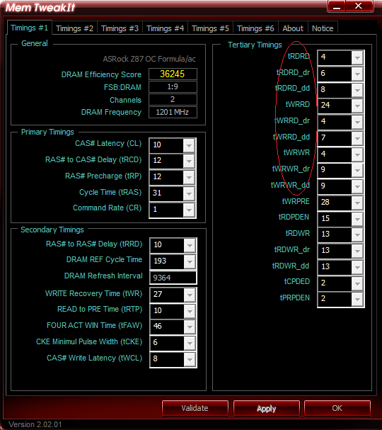 Trotwood, попробуй зафиксировать третичные тайминги на те значения, что биос выставляет автоматом на частоте 2400. Далее повышай частоту памяти и основные тайминги, напруги и т.п. На z68-z77-z87 таким способом можно избежать падения производительности на частотах памяти выше 2400. Выделил нужные тайминги.