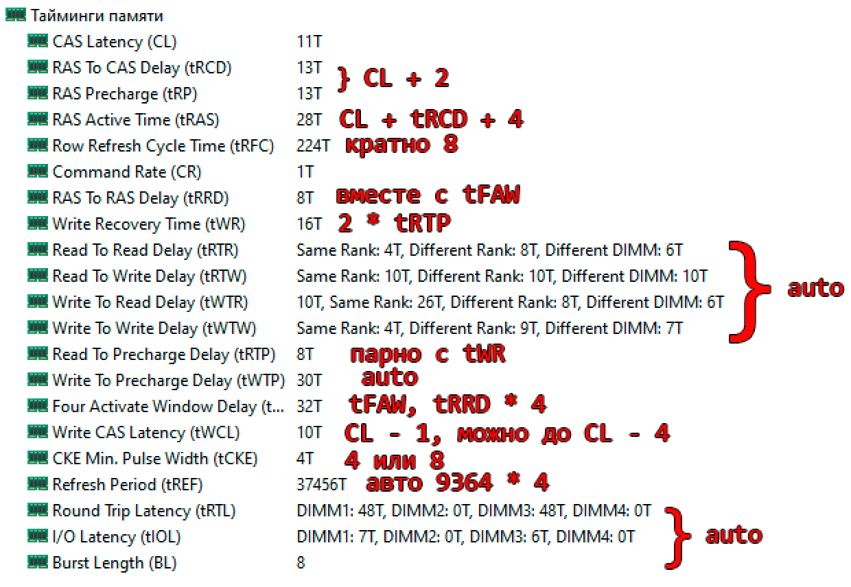 Для ddr3 все намного проще, чем для ddr4, так как нет разных групп банков. RTP у DDR3 может задаваться отдельно от WR. Главное соблюдать соотношения: WR>=CL, правильные значения WR - 5,6,7,8,10,12,14,16 RTP+WTR=WR По стандарту RTP=WTR=7.5 ns, WR=15 ns RCD=RP, так как на физическом уровне это один и тот же процесс (из ячеек памяти в чувствительные усилители, из чувствительных усилителей в ячейки памяти) tRAS>=RCD+CL+2 (лучше 4), снижать можно только из-за того, что при меньшем значении реально биос использует не его. CWL=5 при CL=6 6 при 7,8 7 при 9,10 8 при 11 Таблица CWL из JEDEC в зависимости от частоты памяти: CAS write Latency (CWL) Частота памяти= 2000/tCK(avg) 5 (tCK(avg) ≥ 2.5 ns) 6 (2.5 ns > tCK(avg) ≥ 1.875 ns) 7 (1.875 ns > tCK(avg) ≥ 1.5 ns) 8 (1.5 ns > tCK(avg) ≥ 1.25 ns) 9 (1.25 ns > tCK(avg) ≥ 1.07ns) 10 (1.07 ns > tCK(avg) ≥ 0.935 ns) 11 (0.935 ns > tCK(avg) ≥ 0.833 ns) 12 (0.833 ns > tCK(avg) ≥ 0.75 ns) RTW=CL-CWL+6 WTP=4+WR+CWL WTW=4 RTR=4 RRD=4 FAW=16 RC=RAS+RP tREFI чем выше, тем лучше, если нет ошибок, никаких нет оптимальных средних значений