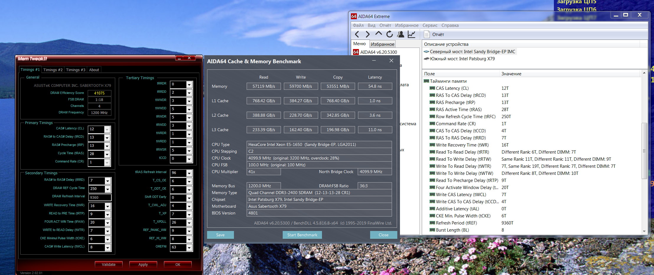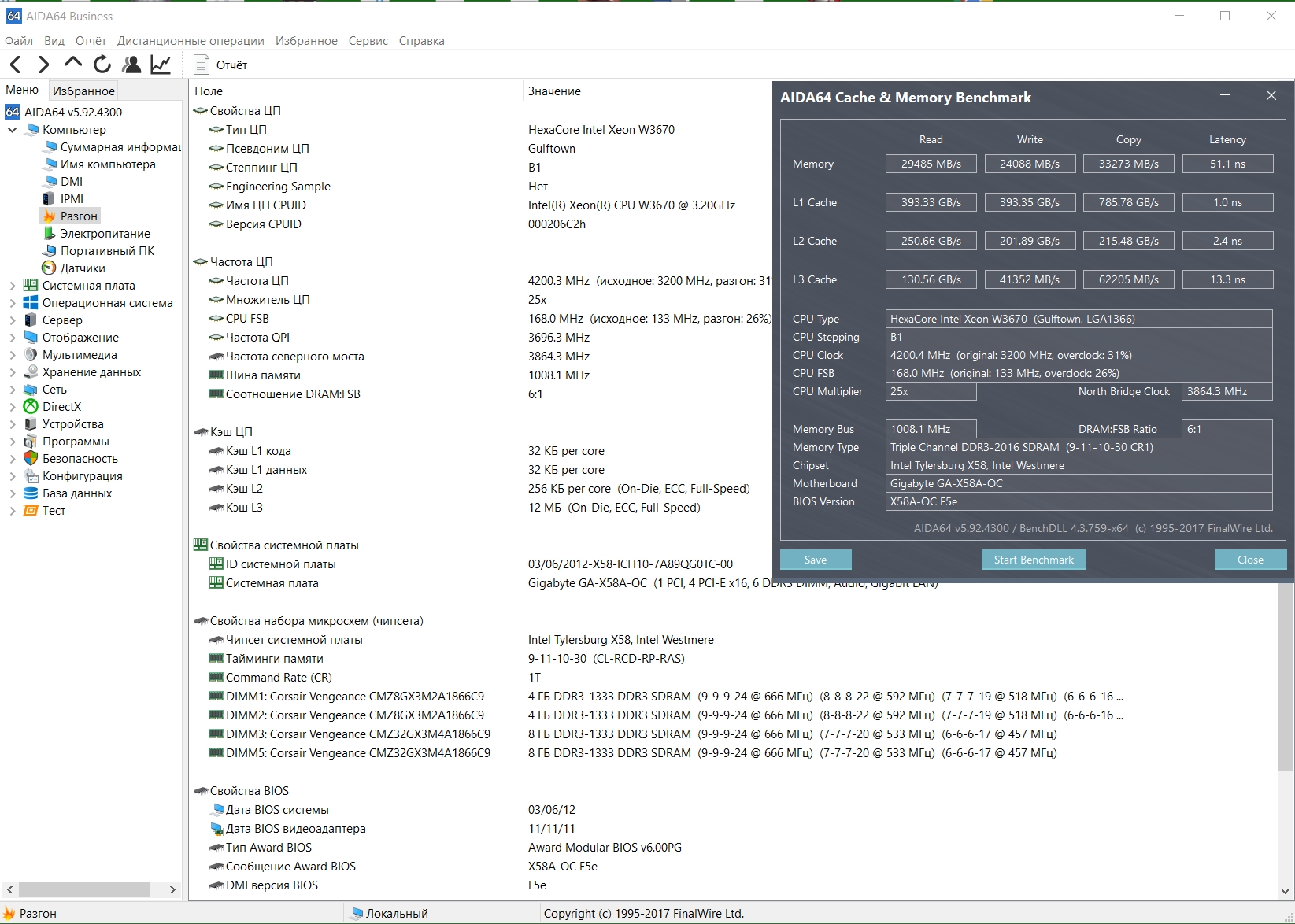 4 плашки по 4гб китайской Atermiter 1866Mhz (на деле PC3-14200 1778Mhz) в трехканале, на чипах самсунг K4B2G0846Q (в SPD зачем-то зишили эльпиду с несуществующими чипами). Выжал полный максимум на 2100Mhz 9-11-10-24-2 1.65v, как мне кажется. Для такой шины, по крайней мере, дальше не могу гнать, проц очень неудачный и нужен вольтаж за 1.4. CR1 не запускаются даже на CL14.