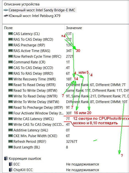 а так как обычно по базе от anta777 => Статистика разгона памяти DDR3. Обсуждение результатов. Советы. #16517982: tRTP+tWTR=tWR в купе с tWR≥tCL и значениями tWR - 5,6,7,8,10,12,14,16; для простоты tWR=2xtRTP=2хtWTR ака tRTP=tWTR; tRAS≥tRCD+tCL+4; tFAW≥tRRD*4; tRC≥tRAS+tRP tWTR≥4,tRRD≥4. ______________ tWCL=tCL-1(если tCL-нечётный) и tWCL=tCL(если tCL чётный) либо по базе↑ как вариант. ну а tRFC тем выше, чем частота выше + от ранговости зависит и чипов памяти + мега/гигабайтности их плашку составляющих + от напряжения на неё подаваемого, + от tRCD с tRP и лучше завысить до +-248, потом опускать в самую последнюю очередь, в первом приближении можно посчитать как: tRFC =8*tRAS