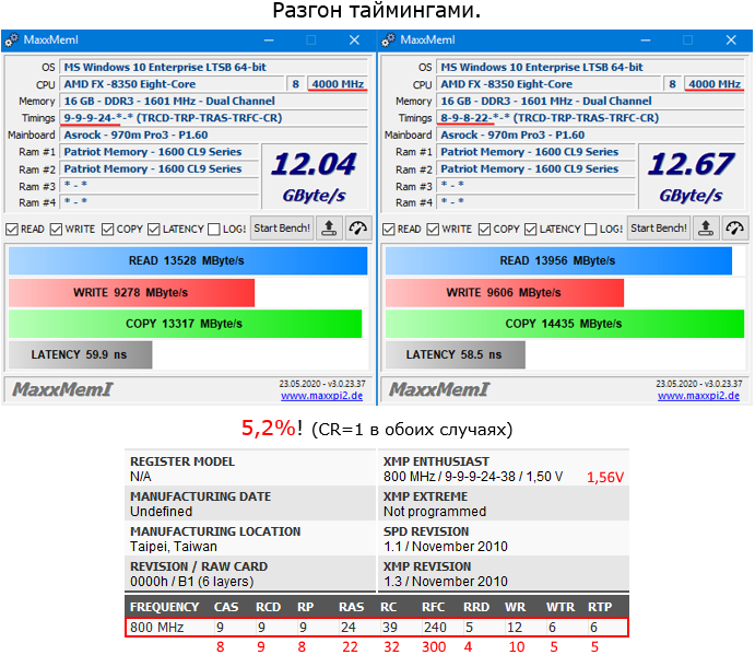 При частоте 800 (1600) МГц память успешно проходит тест MemTest86 (1 прогон - 41 мин.), но в Mirror's Edge Catalyst через 10-15 минут намертво зависает. При частоте 833 (1666) МГц память успешно проходит тест MemTest86 (прерывал через 3 мин.), но в Mirror's Edge Catalyst через 5-10 минут намертво зависает. При частоте 866 (1733) МГц память успешно проходит тест MemTest86 (прерывал через 3 мин.), но при запуске Windows намертво зависает. Никакие шаманства-танцы с задержками и напряжениями для трёх вышеуказанных вариантов не помогают: увеличивал питание памяти до 1.8 В, северного моста до 1.3, ЦП до 1.5, южного моста до 1.25, шины HyperTransport до 1.3. Подумал наоборот, что может питания не хватать для памяти и северного моста и снизил напряжение проц-а со стандартного 1.45 до 1.35 В - ничего не изменилось.