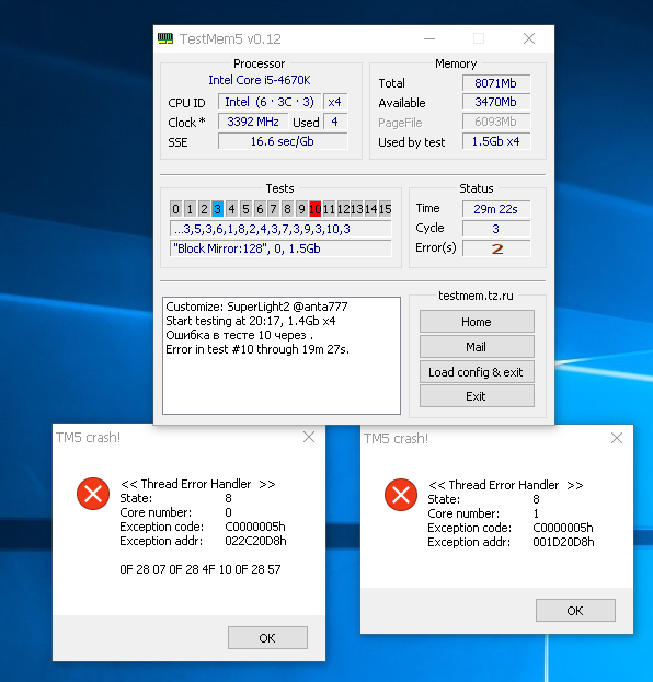 В общем все нормально стартует, но в тм5 на стандартном конфиге стабильно вылезает одна ошибка где-то после 4 минут теста, в одном прогоне была в тесте 0, в следующем прогоне уже в тесте 1. Куда копать? p.s. I/O 1.016в, SA 0.928v