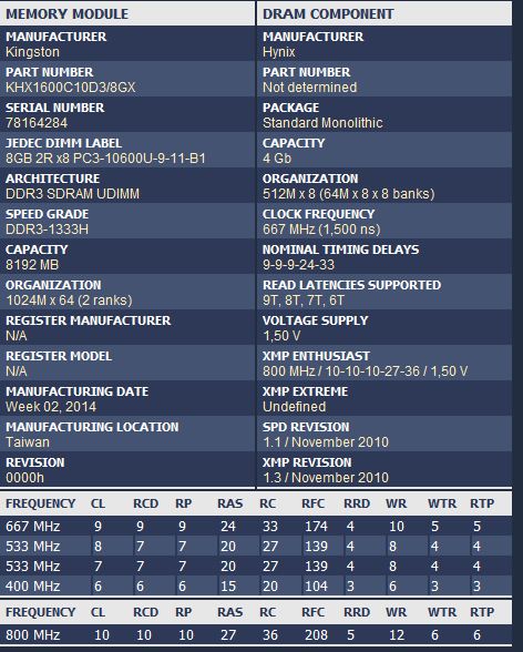 =MF=, в SPD стандартный спидбин DDR3-1333H, тайминги соответственно правильные. Думаю, что надо приступать к диагностике микросхем ОЗУ тем же Memtest, например, или стандартными средствами диагностики ОЗУ в Windows 7 - "Диагностика проблем с памятью компьютера".