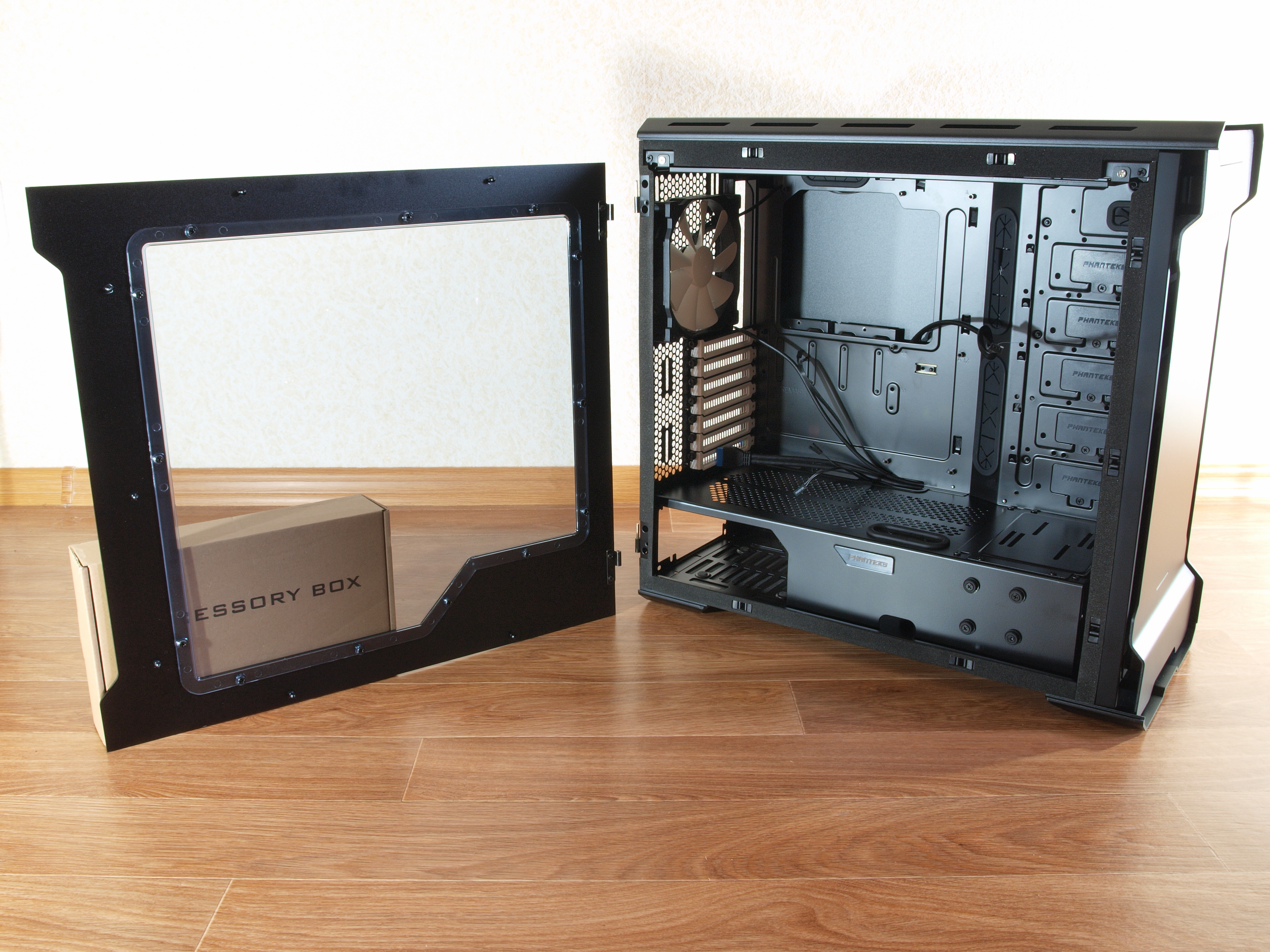 Очень хотел серебряный корпус (серый), но были черный и белый: заказал черный. Понравилось многое, смысла думаю нет перечислять их - все есть в обзорах, однако, в качестве антипода есть несколько замечаний: 1) разработчики из Phanteks будто издеваются - сначала версия mini, потом ITX, теперь ATX. У корпуса гигантский потенциал и сделать полноценную версию E-ATX им ничего не стоит! По паре сантиметров в длину и ширину под материнкую плату, и все! Но нет, пока версия АТХ с ограниченной по ширине до 264 мм для Е-АТХ. P.S. полноценные платы идут до 275! мм. Как раз для пробы такая лежит, а ее вставить не могу. 2) У меня версия с обычной стенкой и оргстеклом. Статика! Стекло собирает пыль, нет, притягивает. Возможно при активной работе, БП и заземлении этого эффекта не будет, но пока просто смахнуть пыль - целая эпопея - летит обратно.