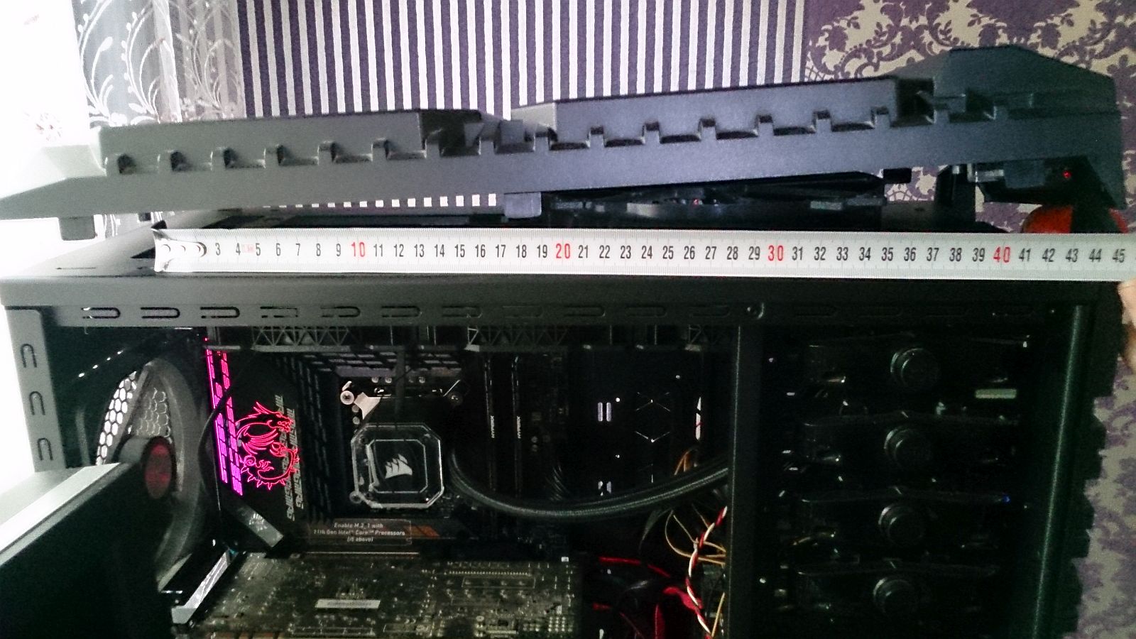 Msi rtx 3080 ti Suprim X не помещается в него , надо корзину высверливать, а учитывая что у меня 6 накопителей , то не представляю куда их ставить, поэтому было решено менять корпус . К сожалению в плане охлаждения будет шаг назад , но что поделать