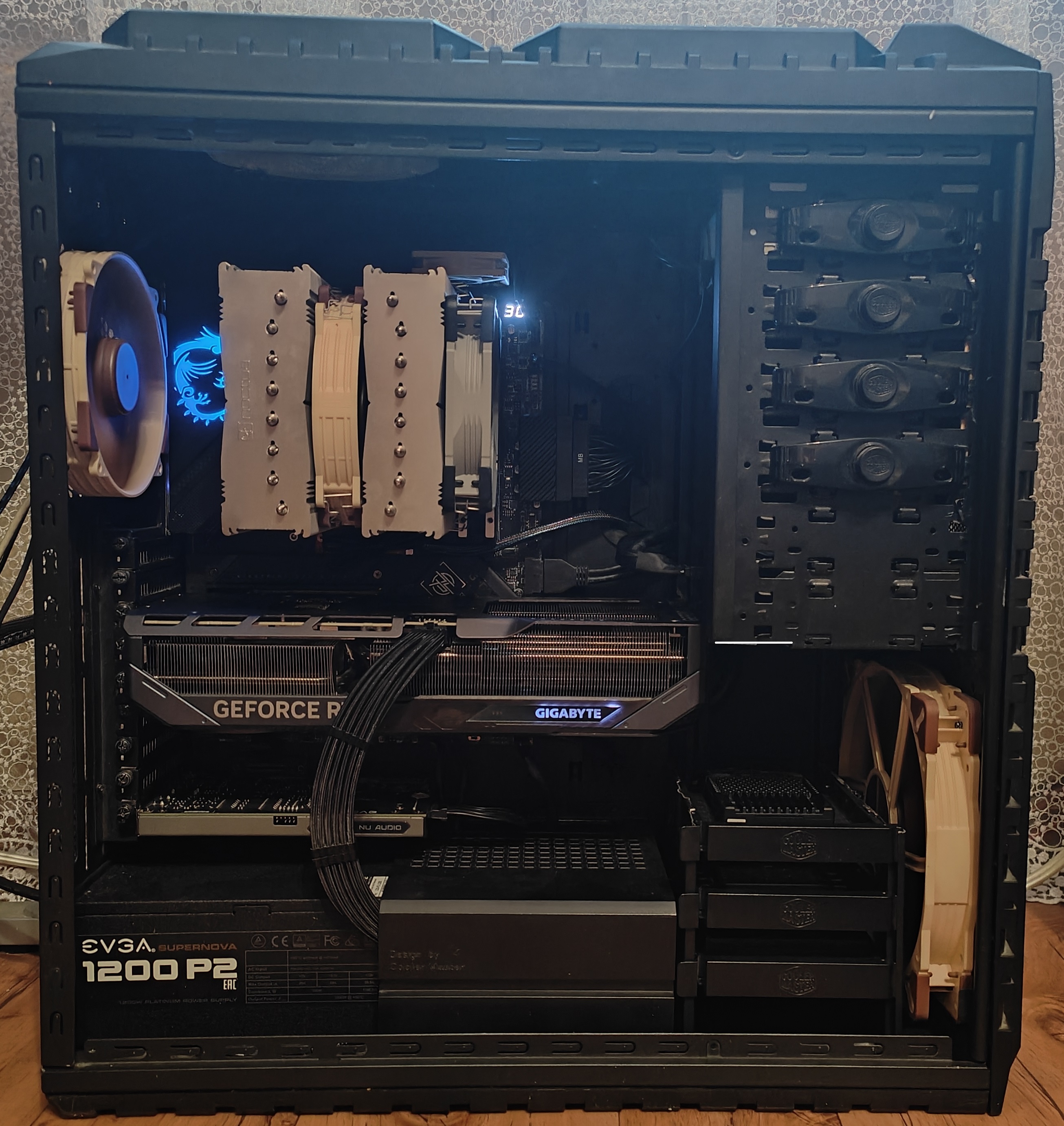 я до этого и покупал 4070тисупер 330мм, оставалось где-то 3мм, потом купил 5070ти 332мм и осталось уже 1-2мм, это всё крайне ограничивает выбор, только бюджетные залазят, а хотелось уже надолго взять что-то хотя бы из среднего сегмента(коей является гига геминг). Фаундерс в наших краях не продаются, это чисто ваша западная тема, у нас их купить нереально, ни разу нигде не видел, да и нужен был уже просто повод, заодно чуть продув лучше стал, вся верхняя половина вентилятора дует без преград вообще. Корпус уже на помойку просится, он у меня остаётся чисто из-за своего функционала - отличный обдув 4-х SSD(для серверных это очень нужно) и разводка видеокарты и звуковой карты как можно дальше, я даже не знаю есть ли вообще сейчас корпуса с 9 слотами PCI-E