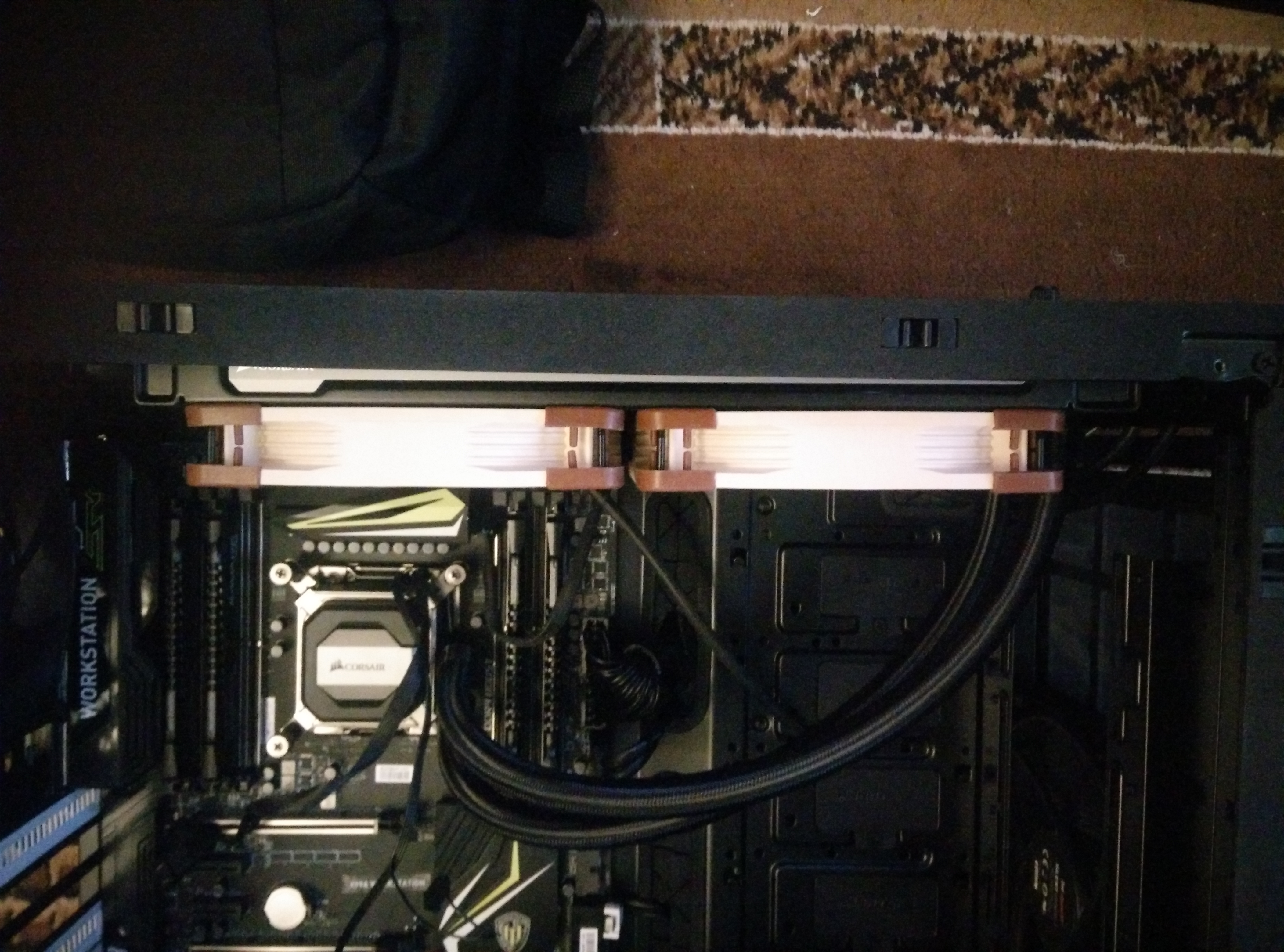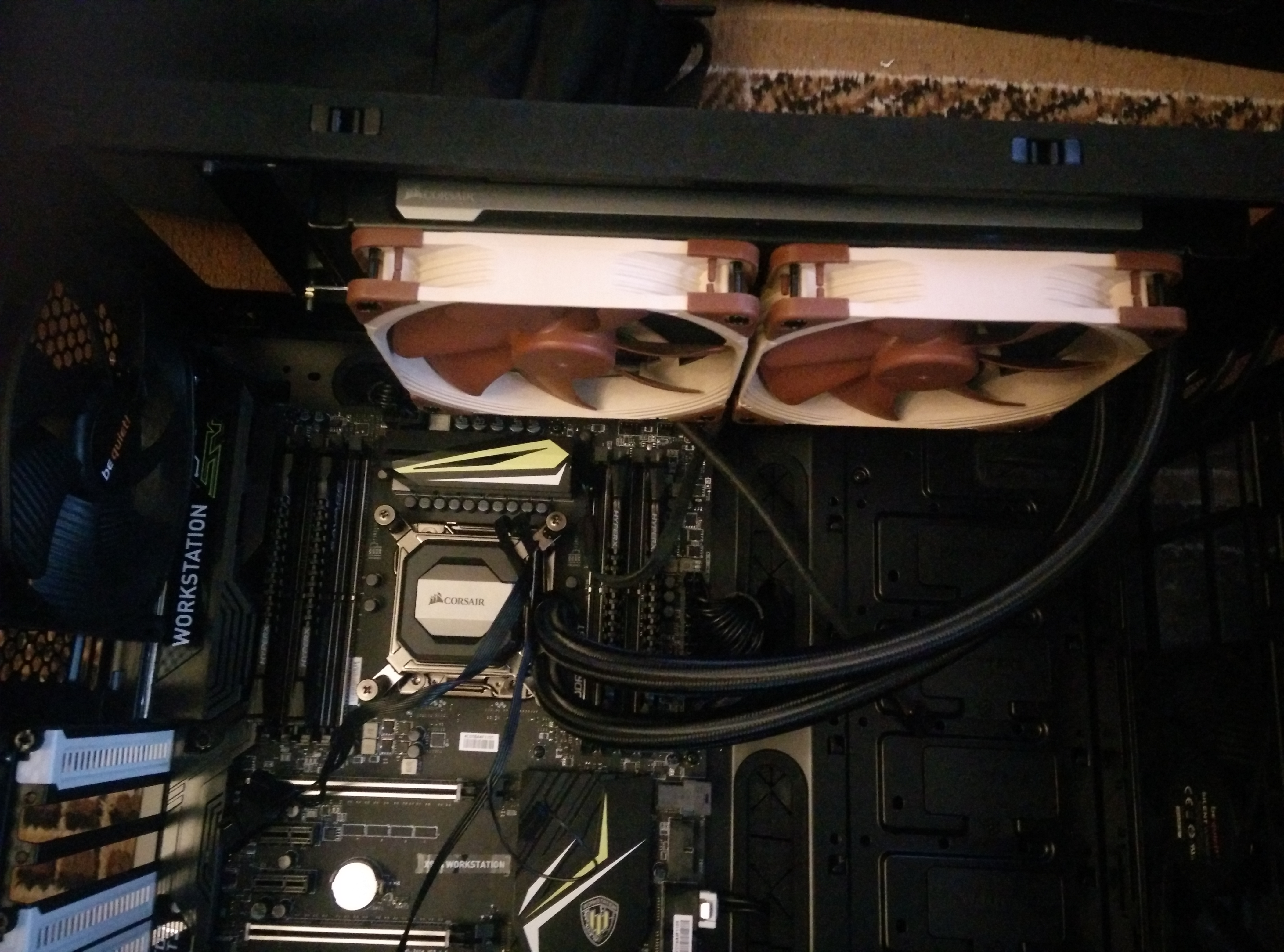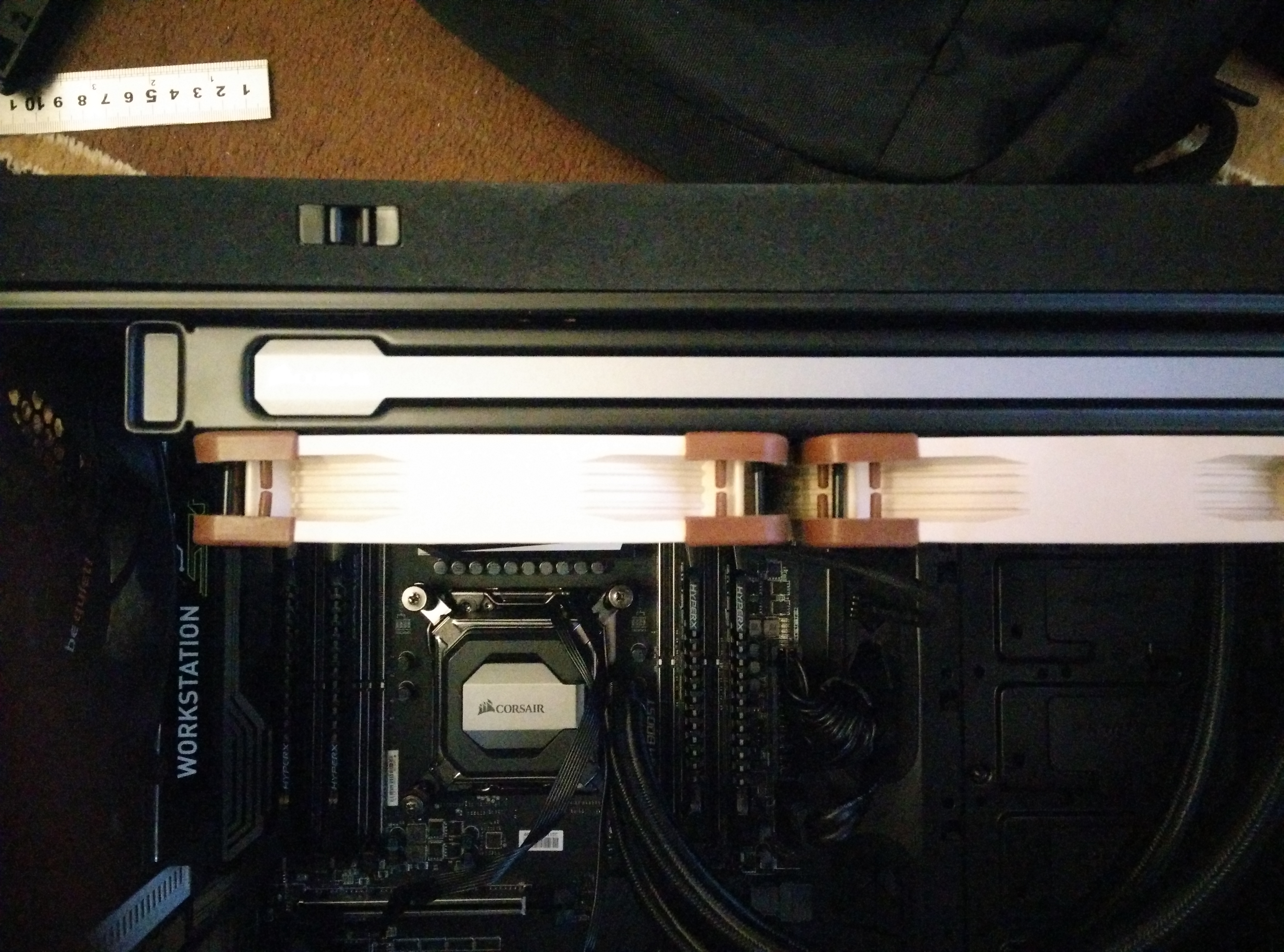 Добавлено спустя 4 минуты 33 секунды: Да, легкий перекос радиатора Corsair H110i присутствует, но он вызван тем, что я использовал в передней части комплектные винты с удобной ручки, а они коротковаты, а в магазины пока винты М3 нужной длины не нашел =((