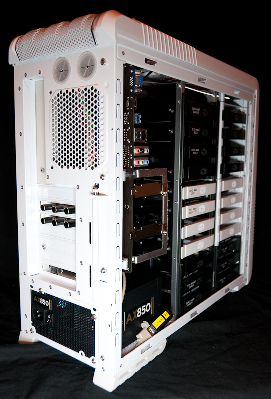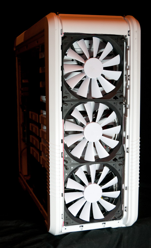 GrayWolf У меня в корпусе 3 вентилятора, спереди 140 на 550об, на корзине 120 на 600об, и сзади на выдув 120 на 600об, всё остальное заклеено оргстеклом.