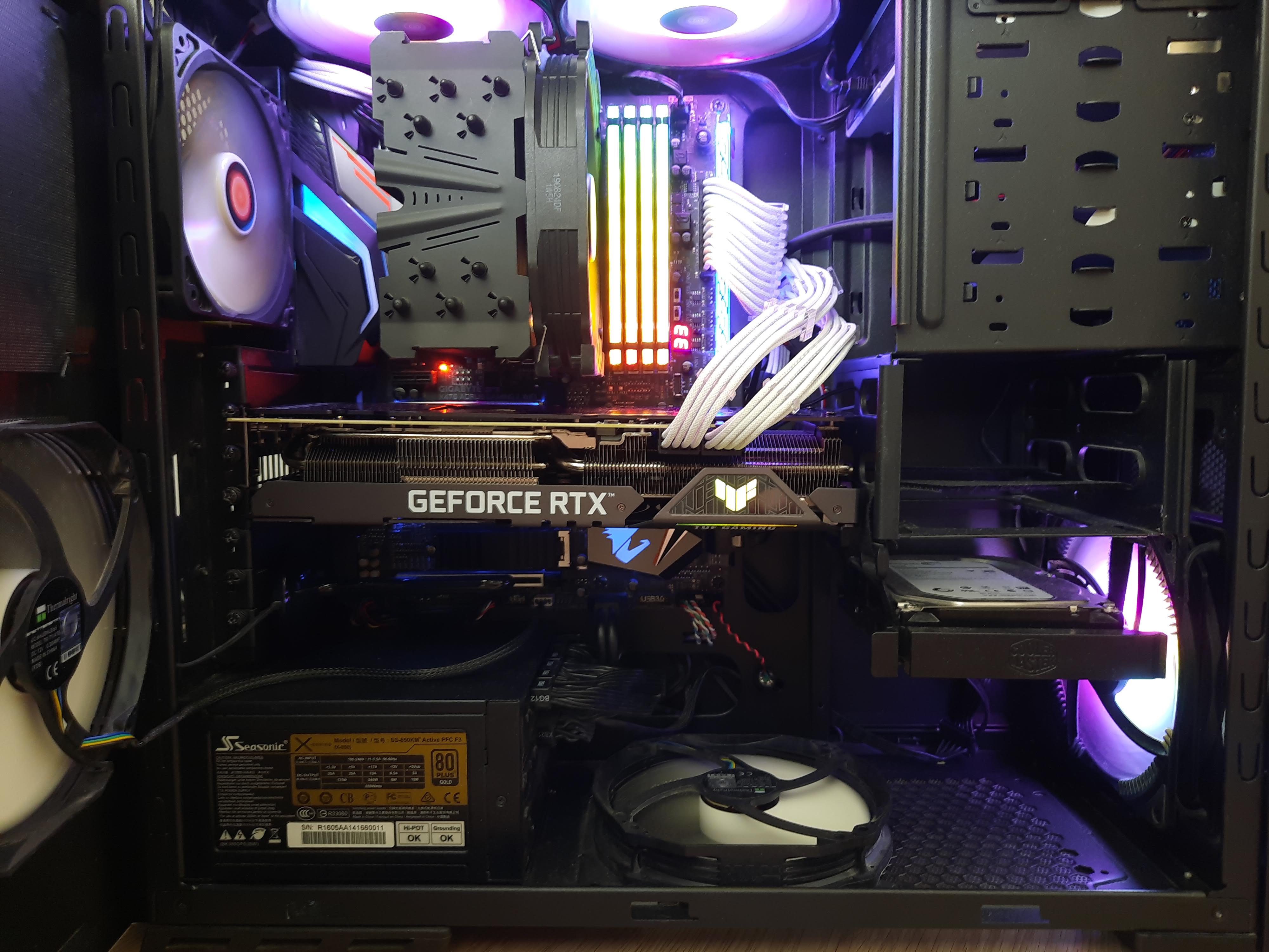 В общем приехала ко мне Asus Tuf RTX 3080, поместилась впритык (пришлось снизу заводить, т.к. на корзине мешал загиб). В итоге всё тип топ. С моим охлаждением карта не задыхается: 3 вентиля на вдув (спереди, снизу, сбоку), 3 на выдув (сзади и сверху), все вентили фиксированы на 800 оборотов. Да, жарит при 340W она знатно. Температуры проца, памяти и m2 SSD поднялись соответственно. Но ничего критичного. При температуре в комнате 27 градусов, в простое GPU - 35, CPU (Ryzen 7 2700X) - 40. При прогоне 3D Mark Time Spy Extreme GPU - 65, CPU - 69. Скрин с GPU-Z и фотки с видяхой ниже. Весь конфиг в профиле.